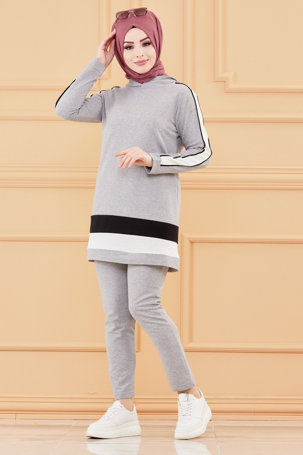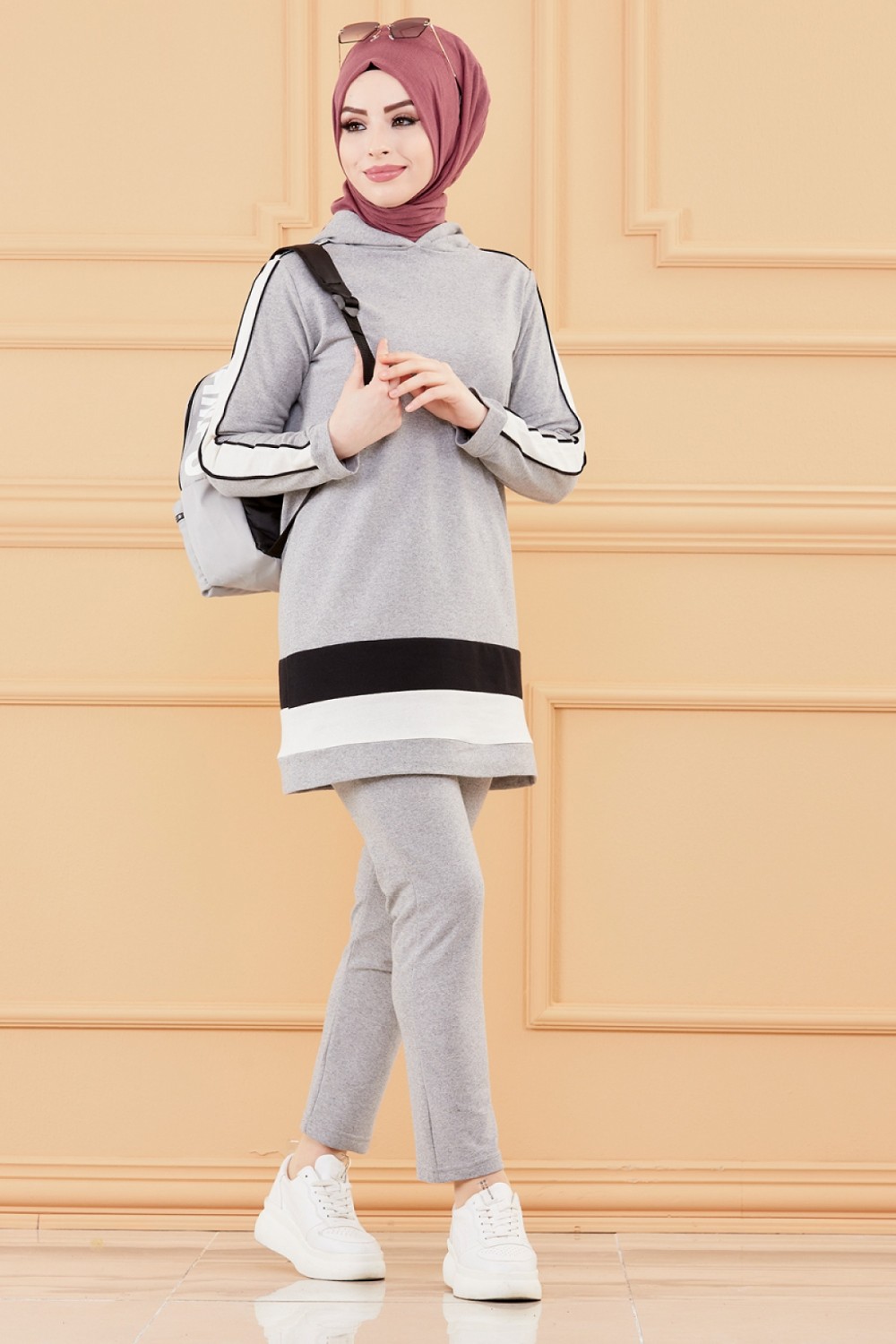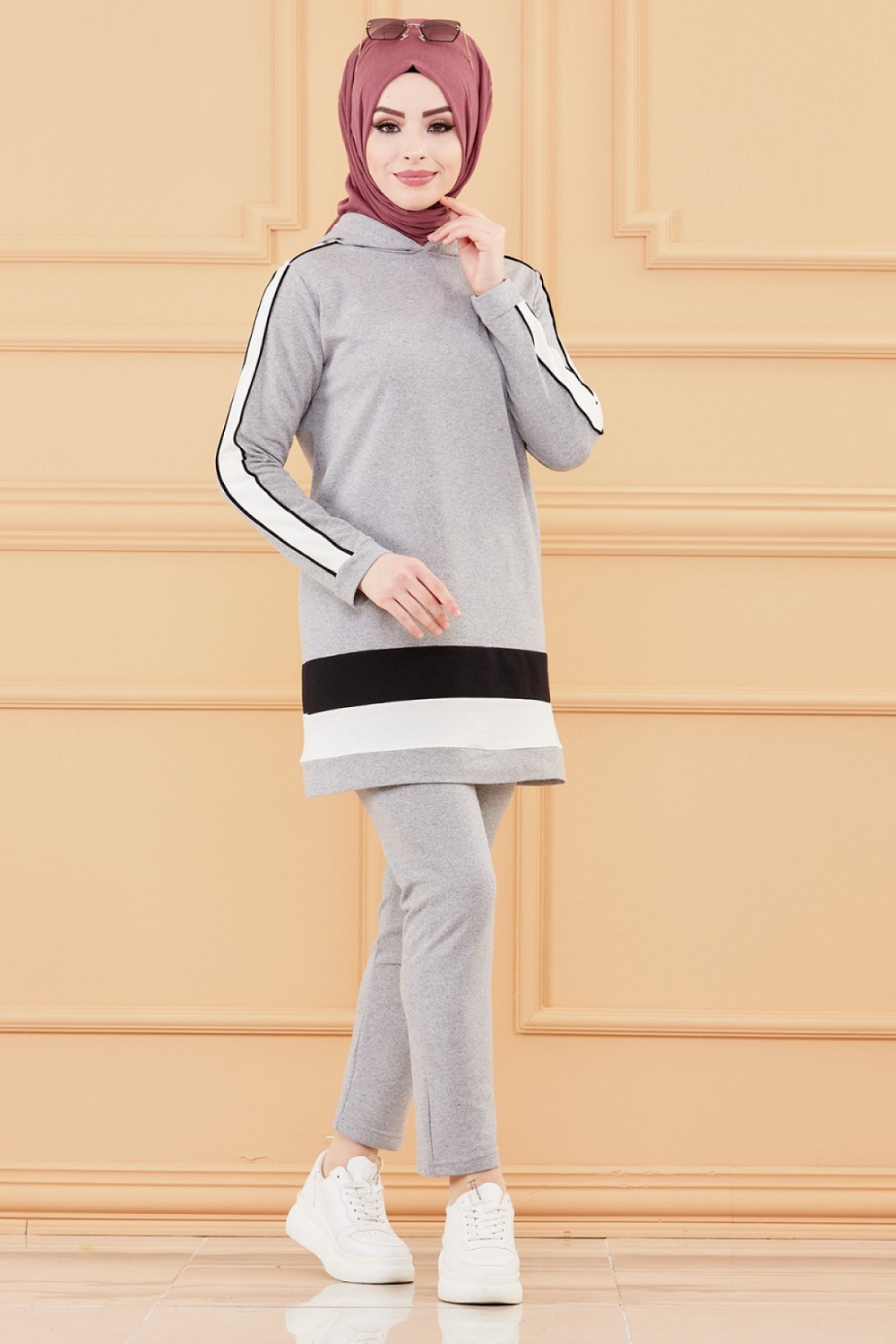 Ensemble décontracté et Survêtement (Hijab Sport pour femme musulmane) - Couleur Gris clair et blanc - REF. 32199 (25.00 €) - En Promotion à 19.90 €