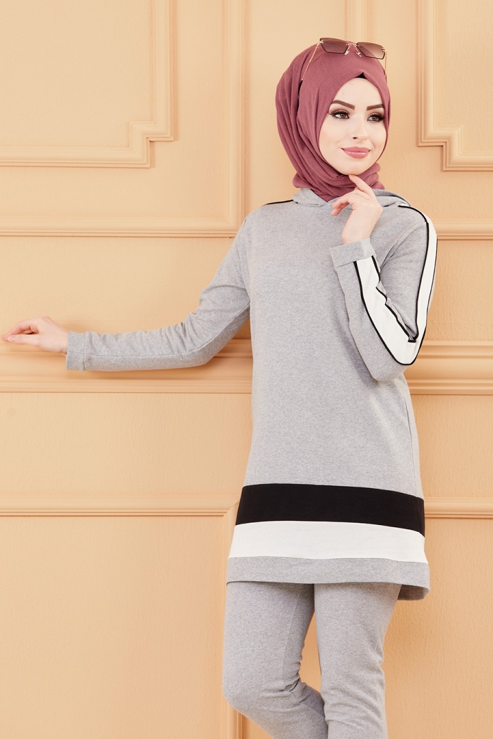 Ensemble survêtement pour femme : Tunique à capuche et Pantalon (Tenue sport Hijab) - Couleur gris clair Vetement & Accessoire
