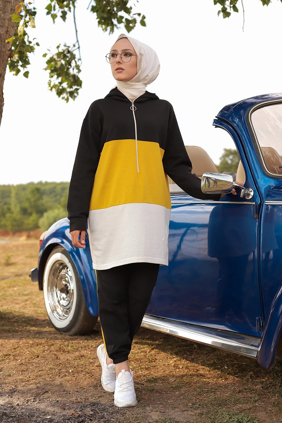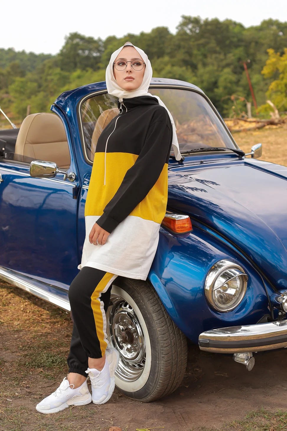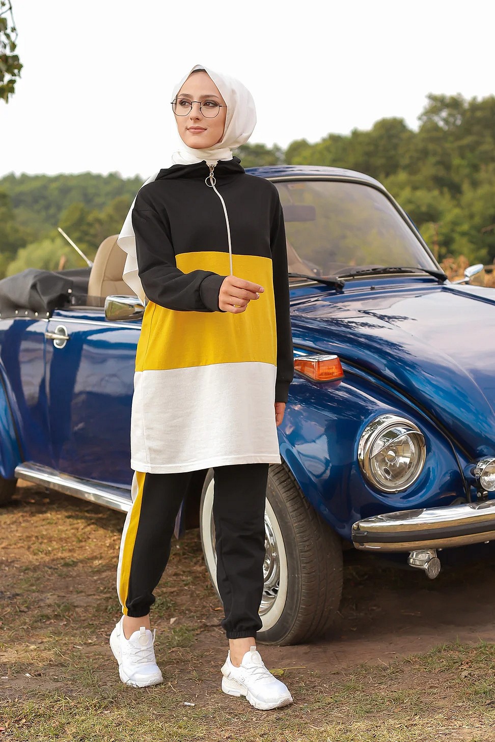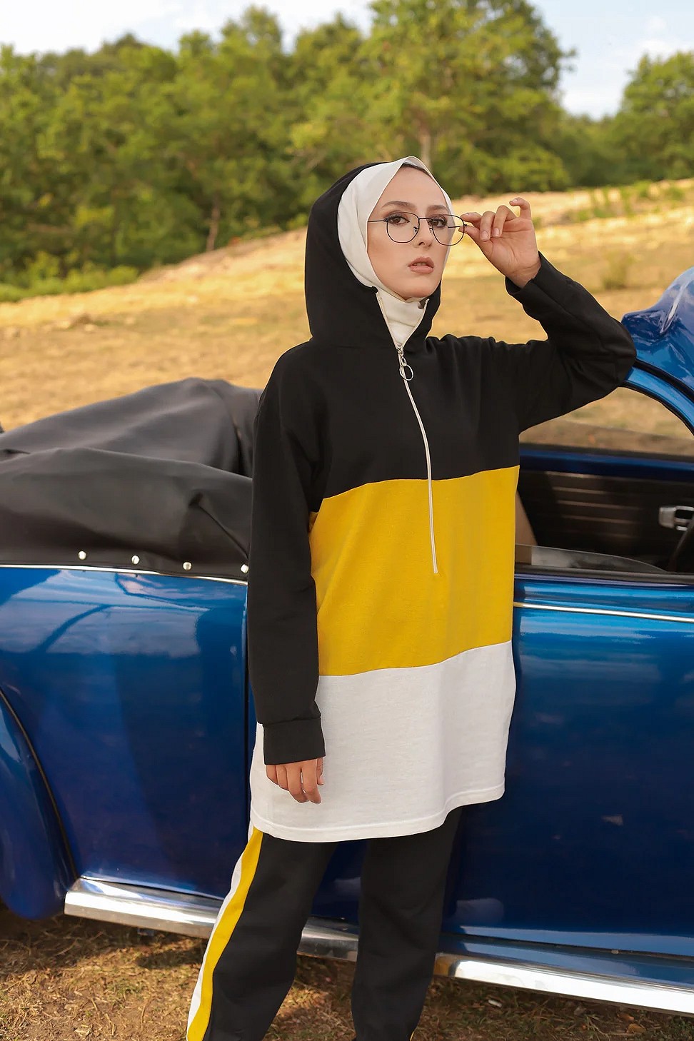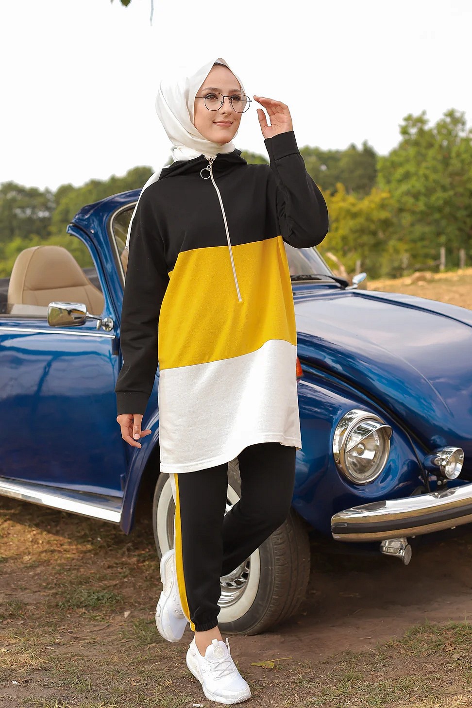 Ensemble survêtement tricolore pour femme : tunique zippée à capuche et pantalon (Vetement islam) - Couleur noir blanc et Jaune Vetement & Accessoire