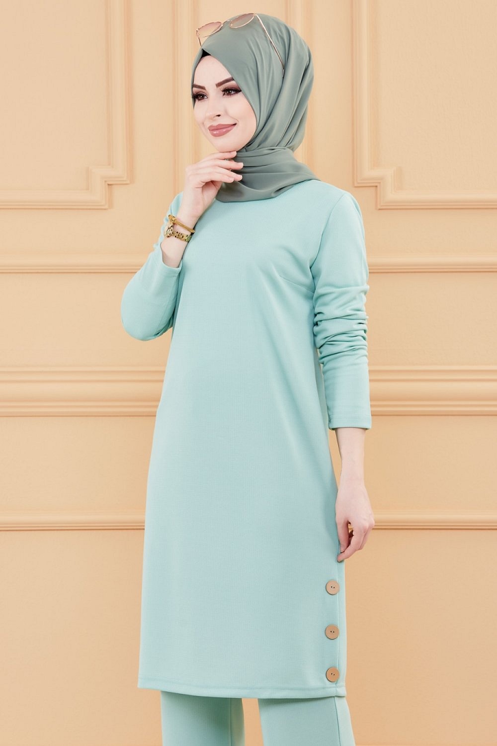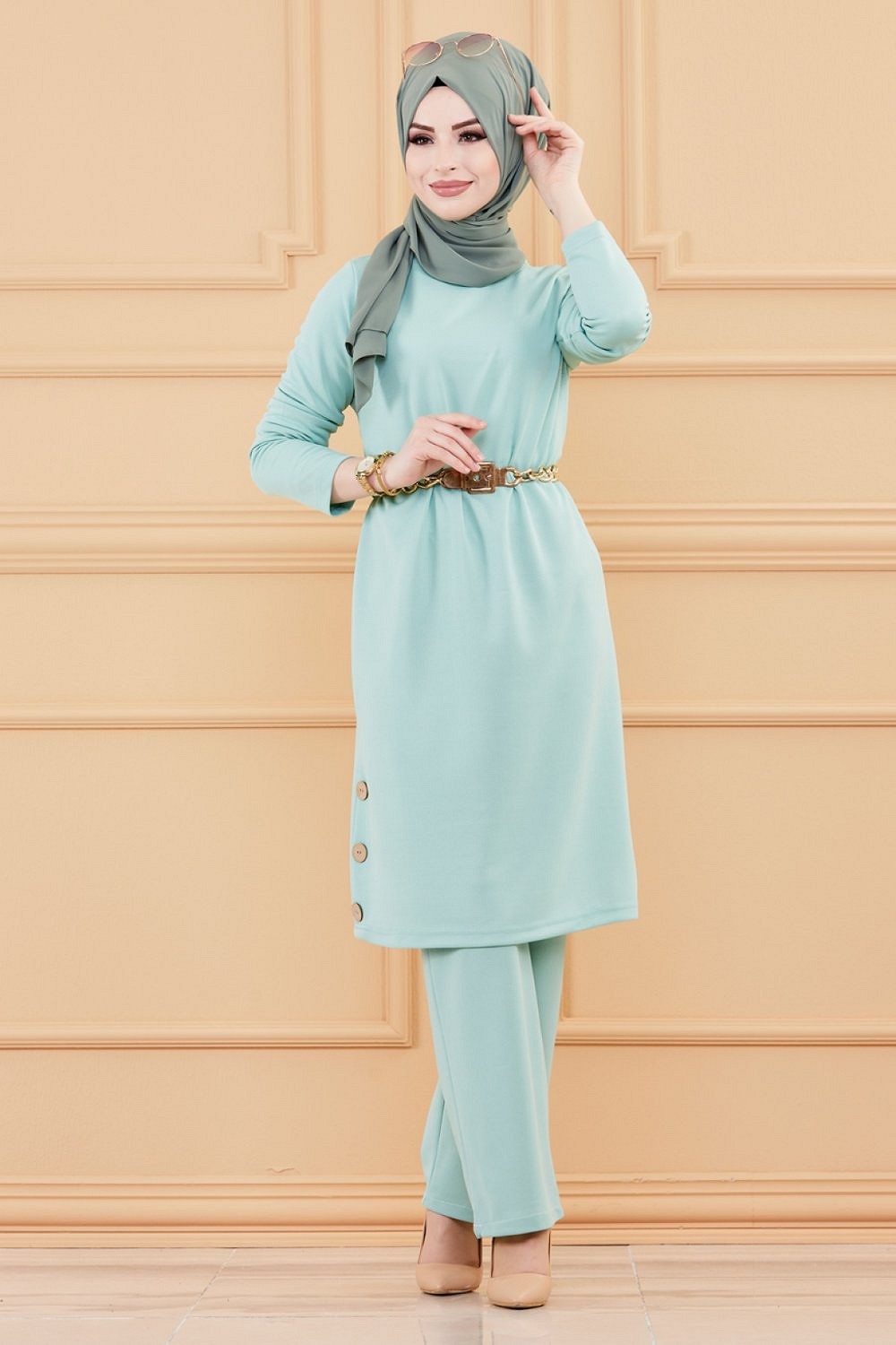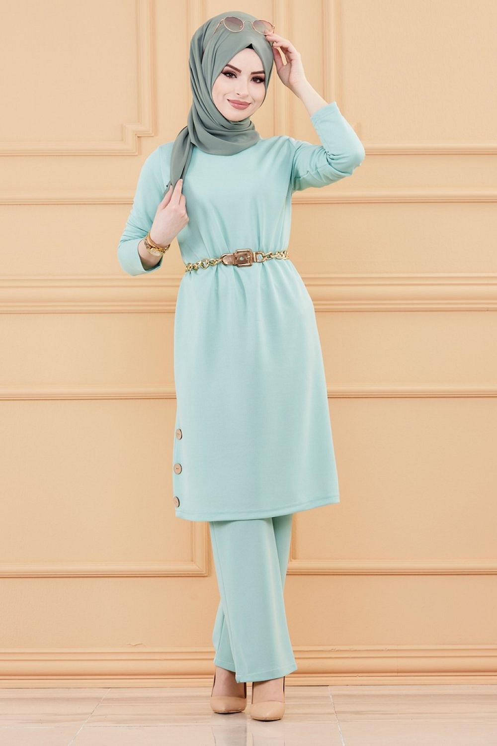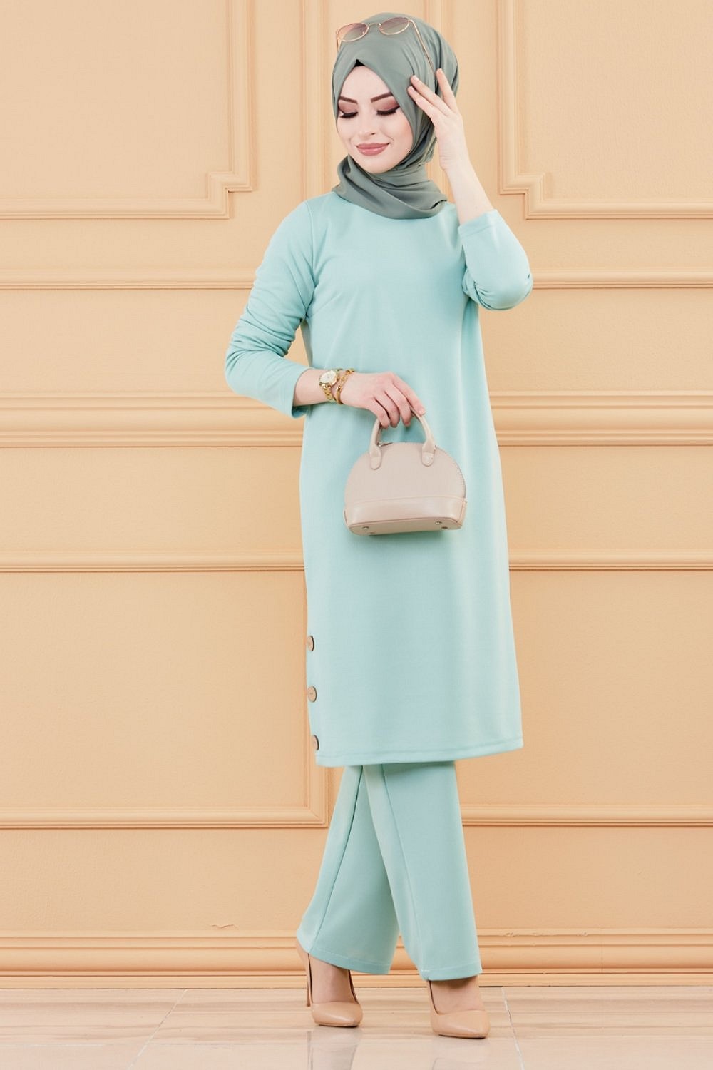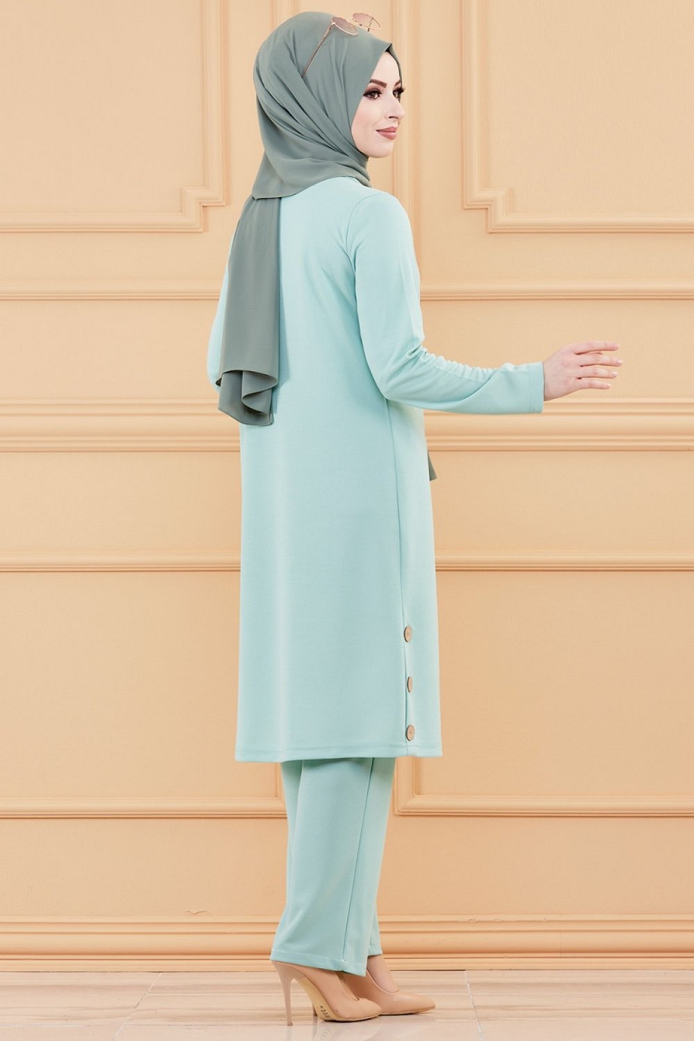 Ensemble tunique à boutons et pantalon assorti pour femme (Tenue hijab classique) - Couleur menthe Vetement & Accessoire