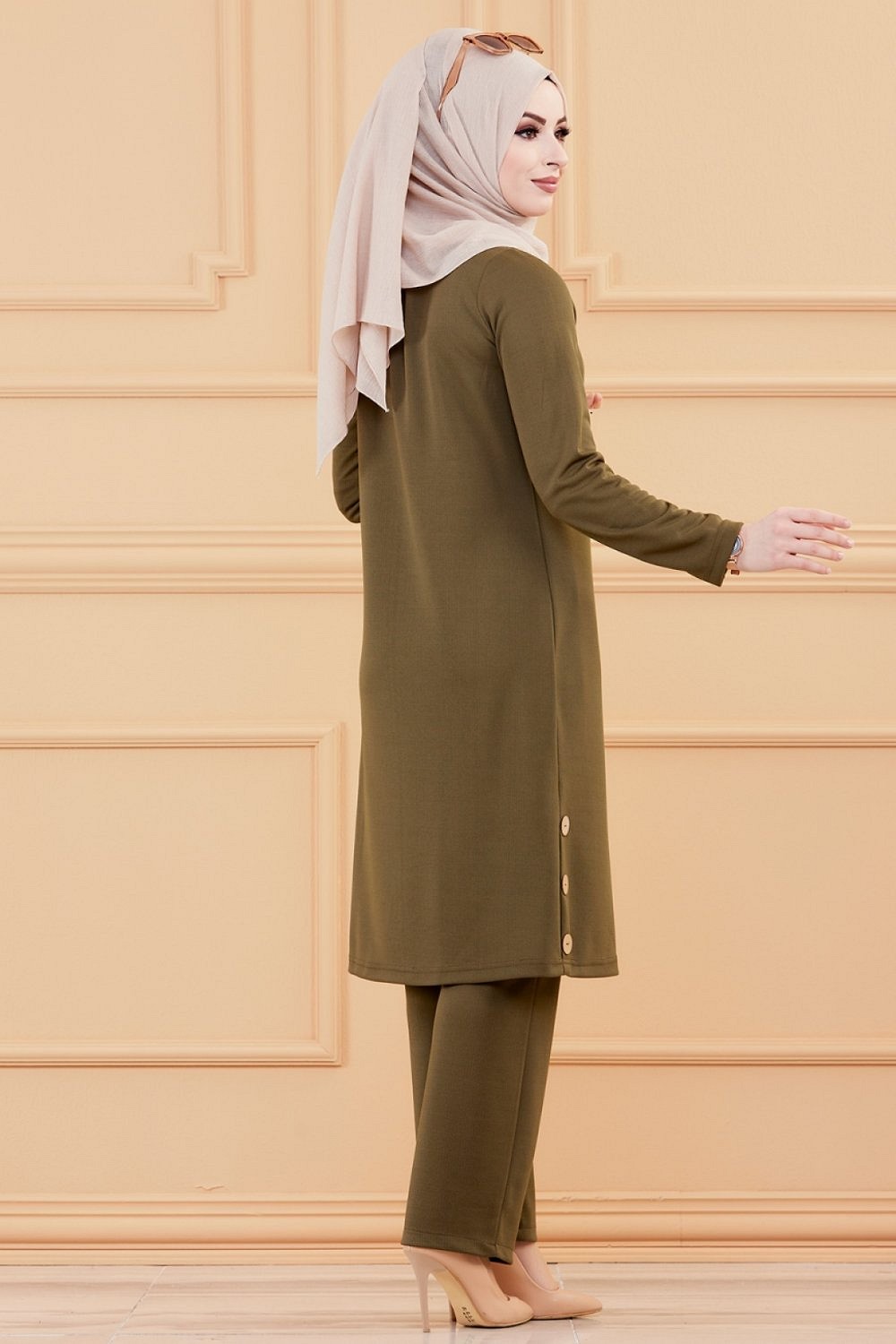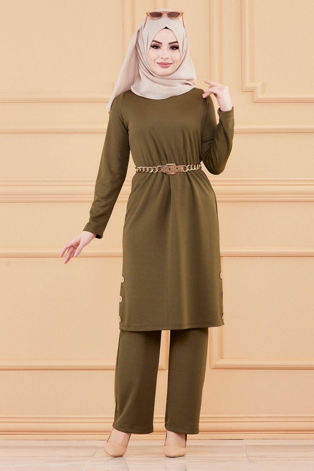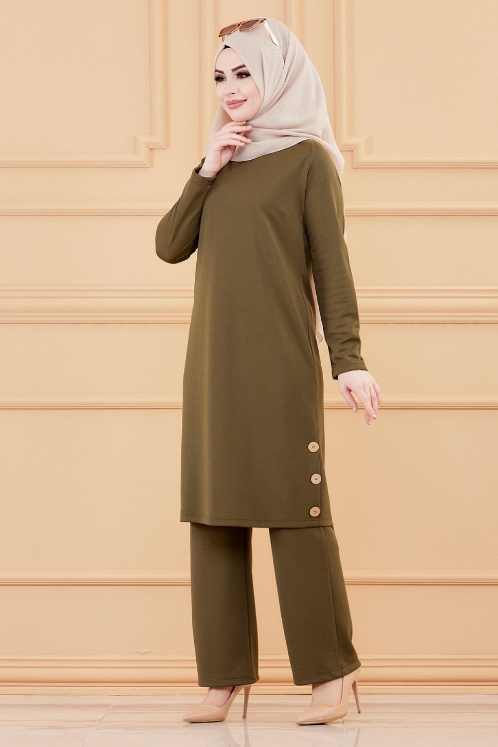 Ensemble tunique à boutons et pantalon assorti pour femme (Vetement mastour pour hijab) - Couleur kaki Vetement & Accessoire