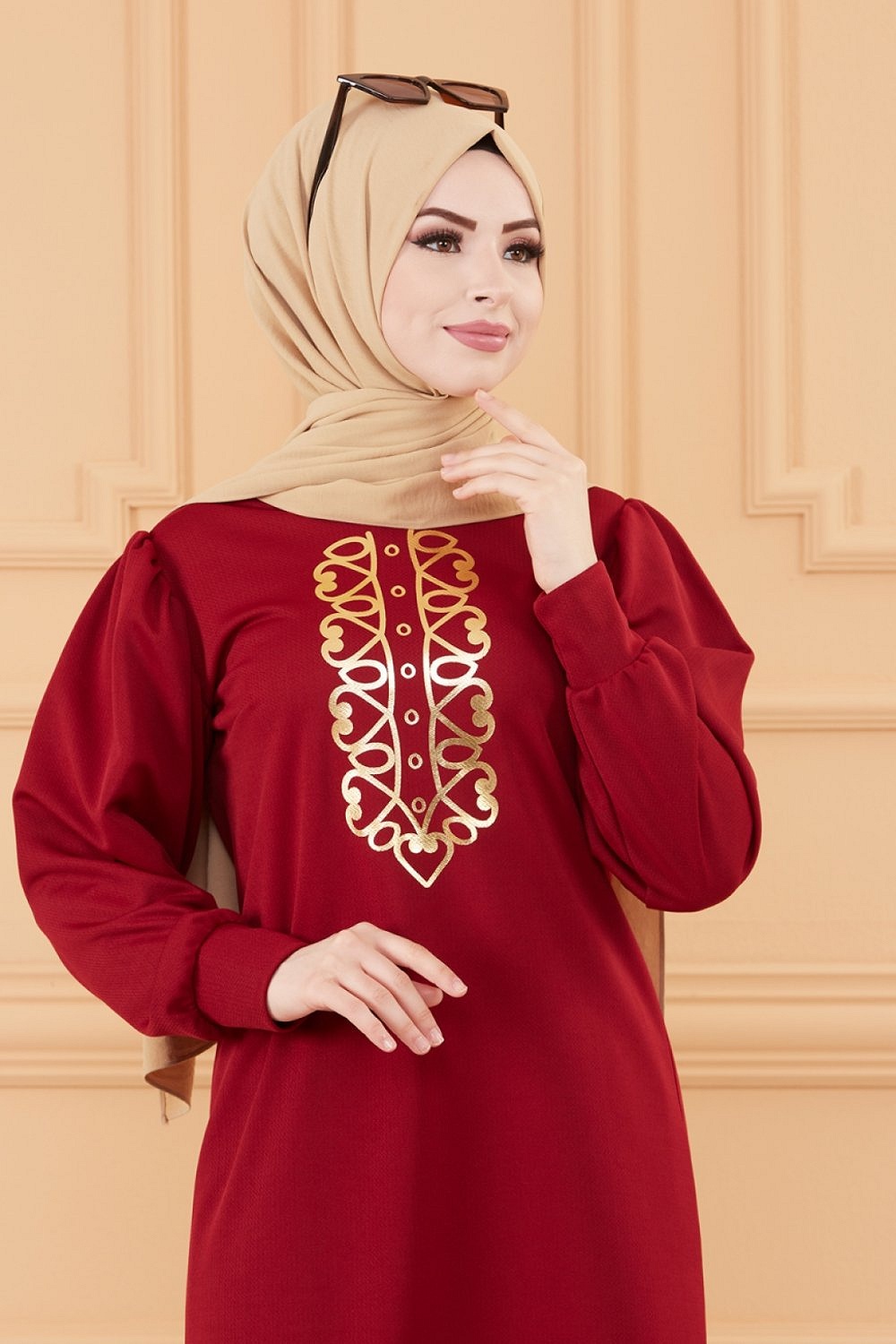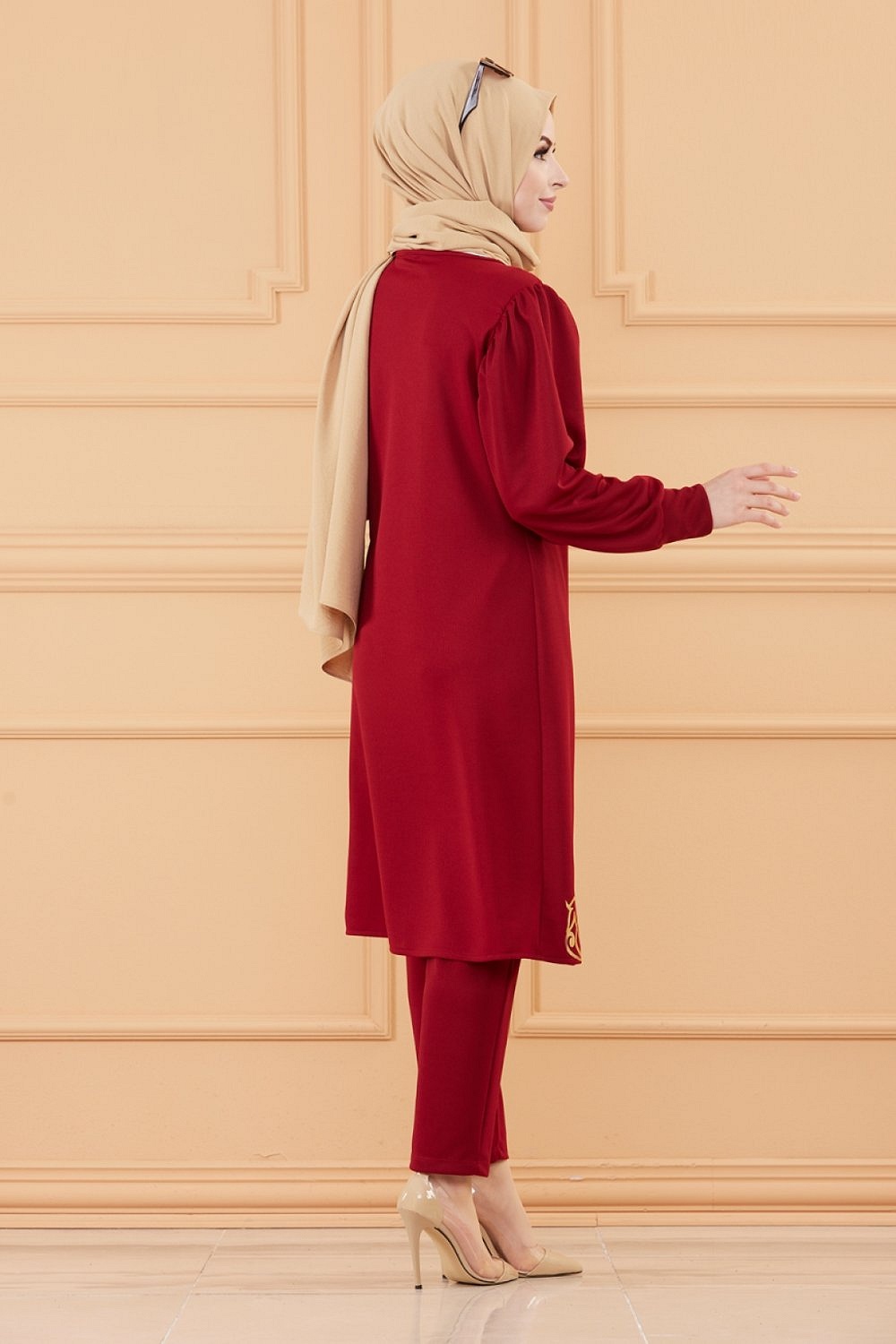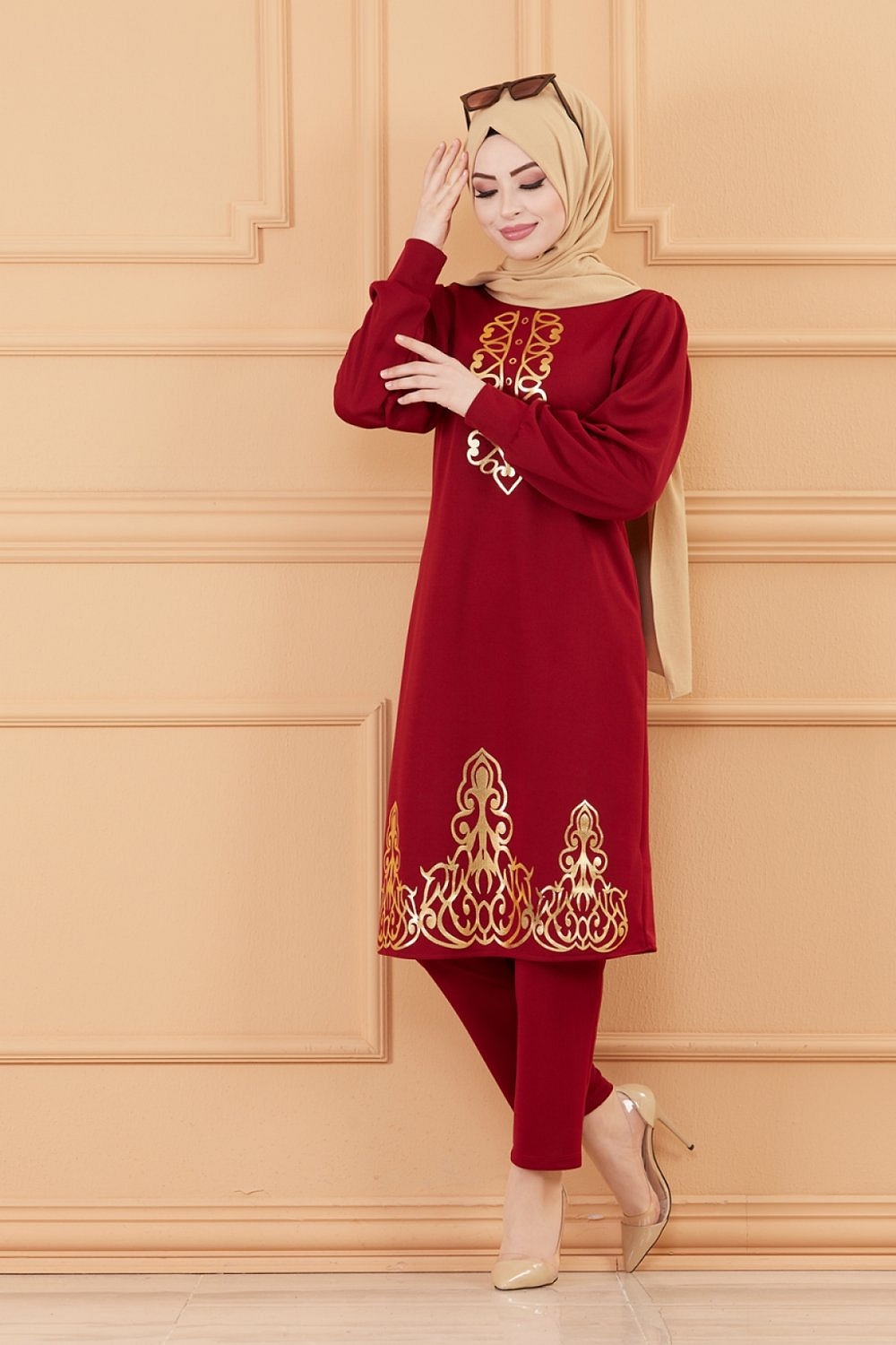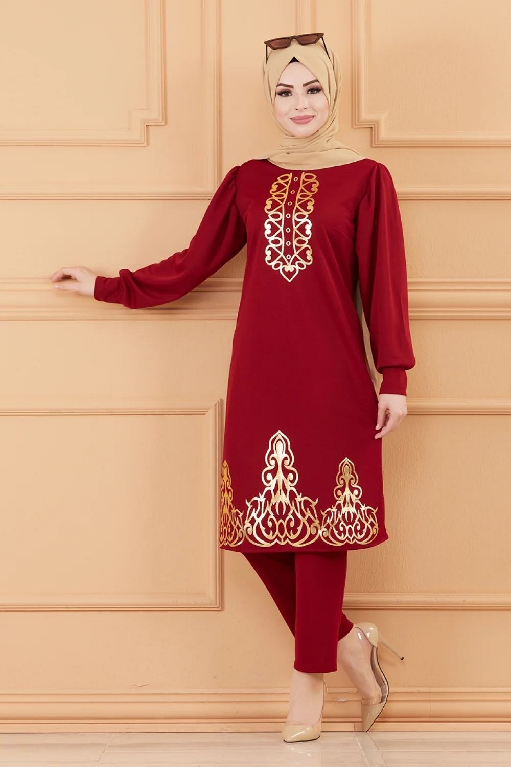 Ensemble tunique dorée et son pantalon (Tenue orientale pour femme voilée) - Couleur bordeaux Vetement & Accessoire