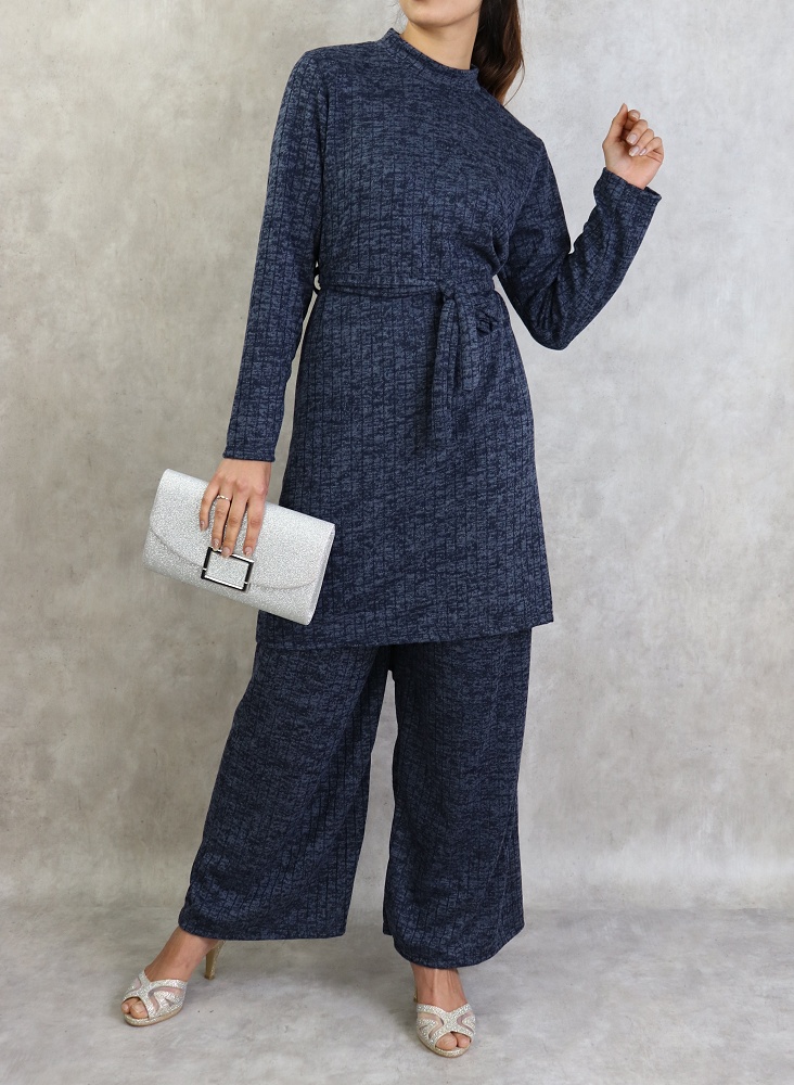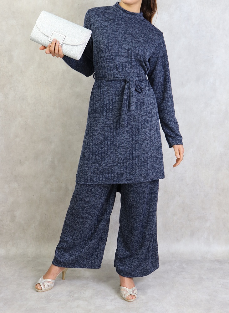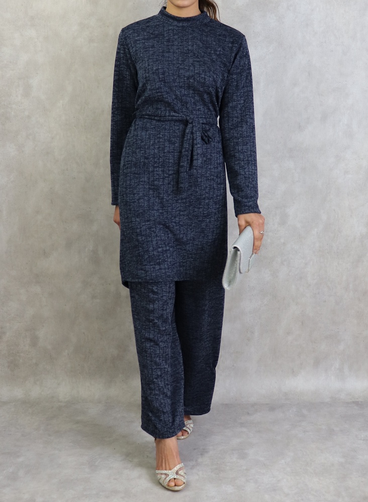 Ensemble 2 pièces. Tunique : mi longue, col montant, ceinture assortie à passants, coupe droite, tissu doux. Pantalon : coupe large taille élastique.