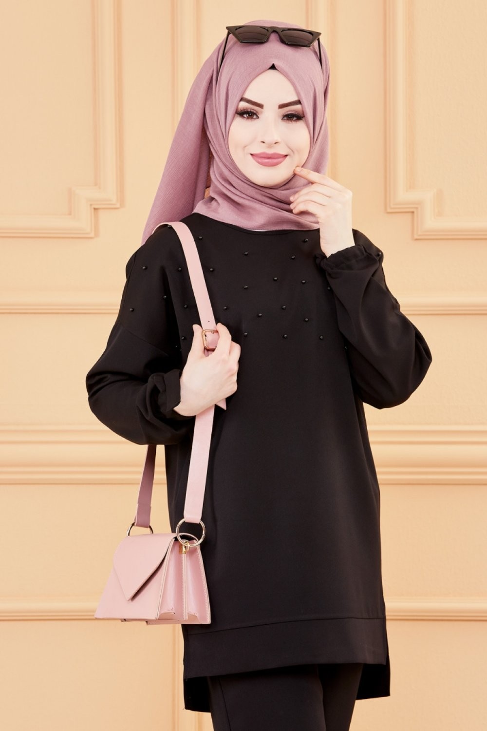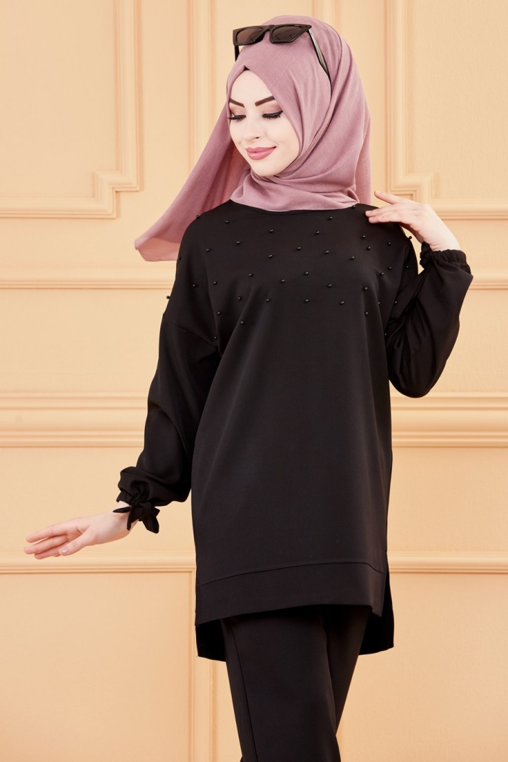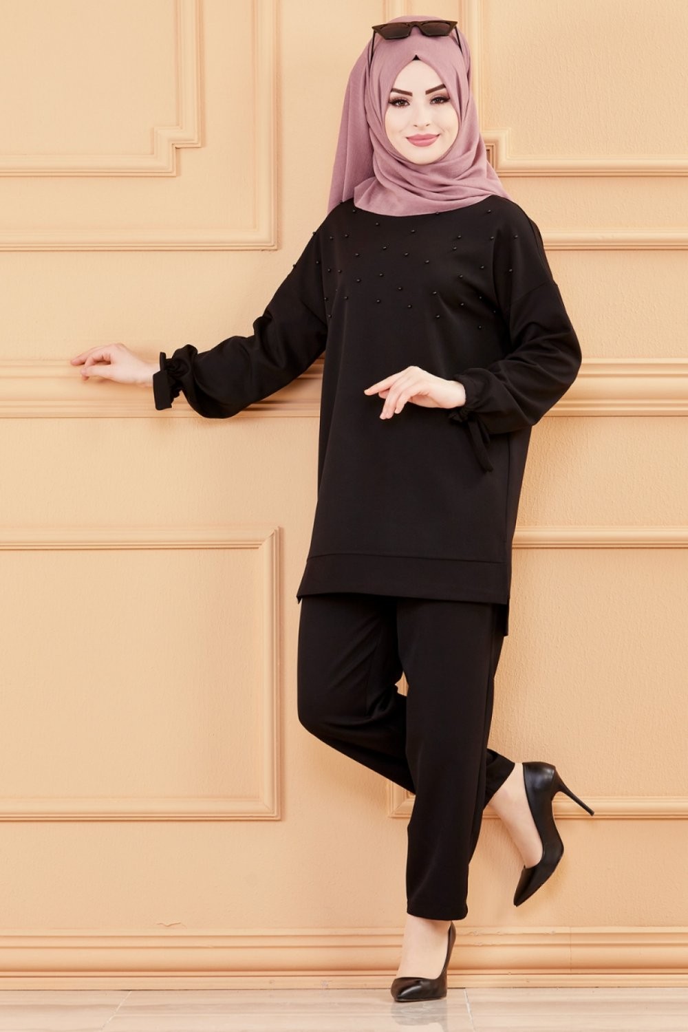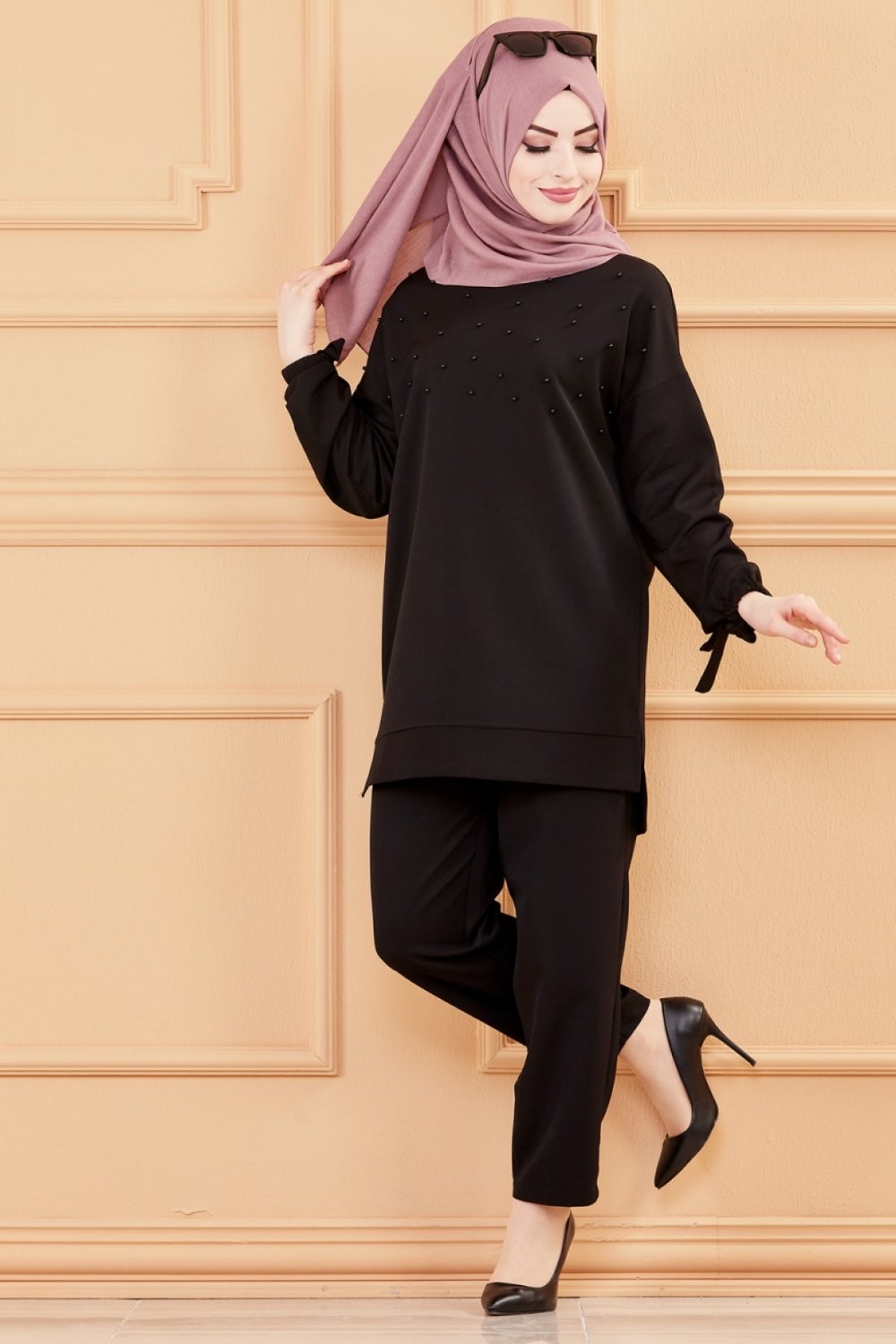 Ensemble tunique perlee et pantalon pour femme (Tenue Hijab style habille) - Couleur noir