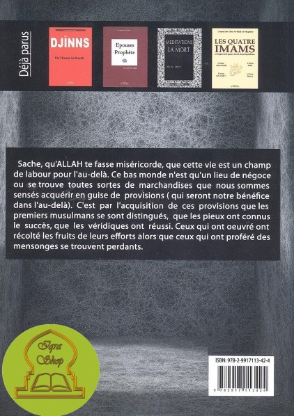 Sache, qu'Allah te fasse miséricorde, que cette vie est un champ de labour pour l'au-delà. Ce bas-monde n'est qu'un lieu de négoce où se trouve toutes sortes de marchandises que nous sommes sensés acquérir en guise de provisions (qui seront notre bénéfice dans l'au-delà).