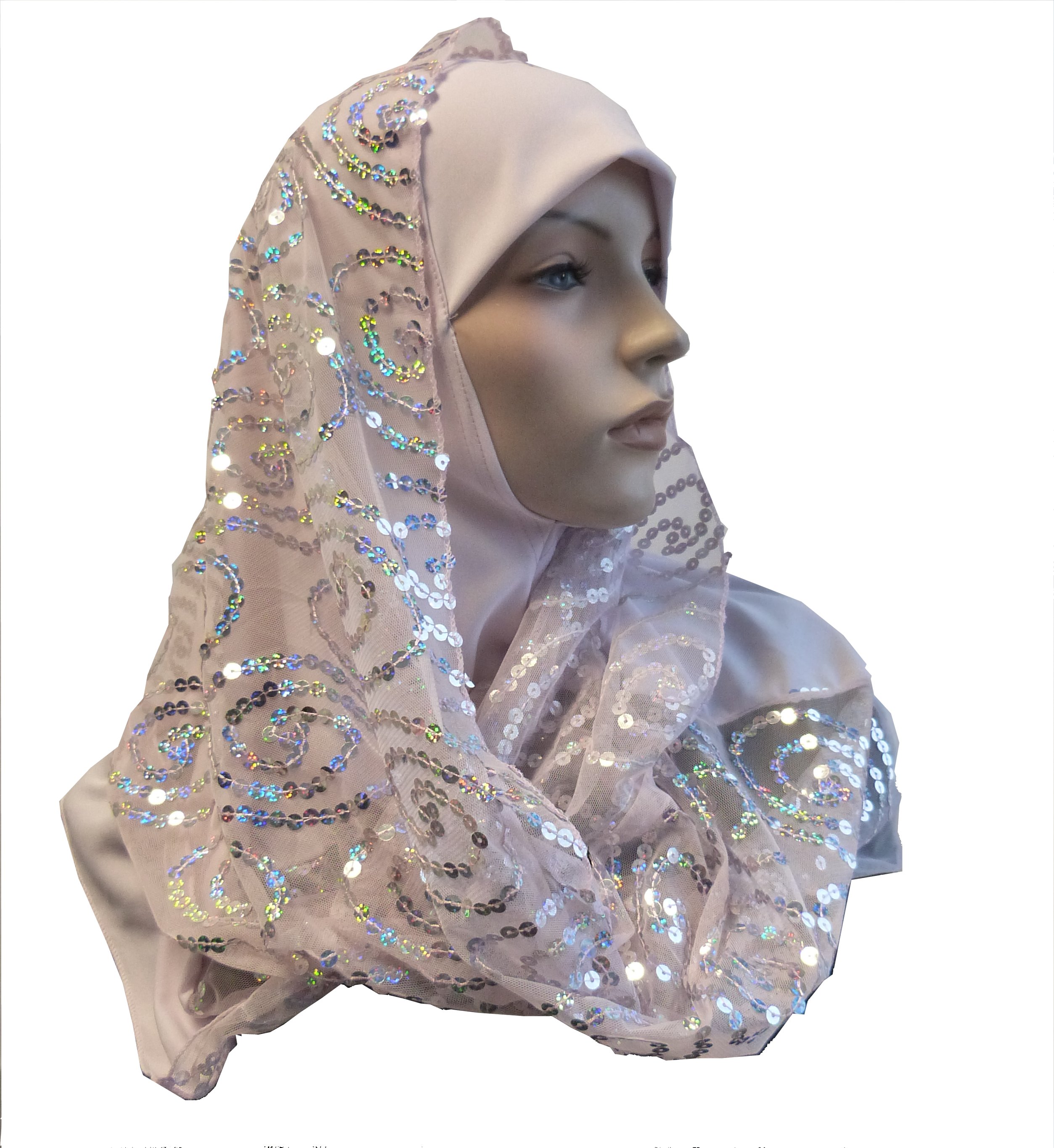 Foulard hijab 1 pièce une partie matière élastique de couleur rose pale et une partie légère à positionner par dessus en dentelles à motifs fleuris et strass.