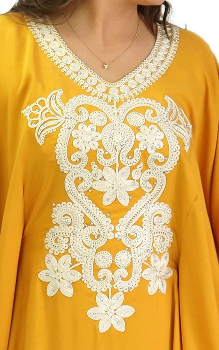 Gandoura / Robe marocaine manches courtes avec decorations - Couleur Jaune