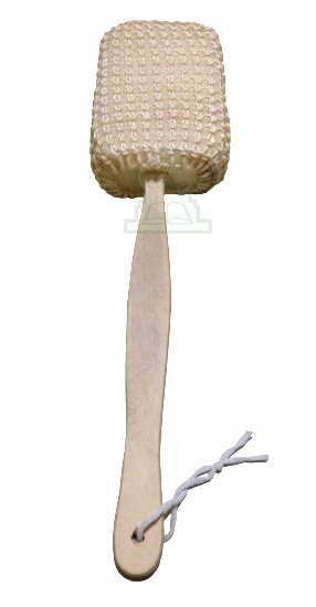 Mousse et crin cellophané. Manche en bois avec cordon de suspension. Très léger, idéal pour se frotter le dos avec un maximum de confort.