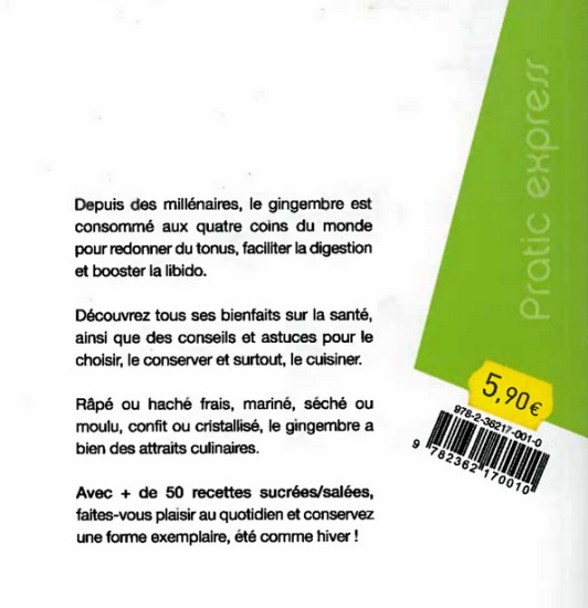 Depuis des millénaires, le gingembre est consommé aux quatre coins du monde pour redonner du tonus, faciliter la digestion et booster la libido. Découvrez tous ses bienfaits sur la santé, ainsi que des conseils et astuces pour le choisir, le conserver et surtout, le cuisiner. Râpé ou haché frais, mariné, séché ou moulu, confit ou cristallisé, le gingembre a bien des attraits culinaires. Avec + de 50 recettes sucrées/salées, faites-vous plaisir au quotidien et conservez une forme exemplaire, été comme hiver !.