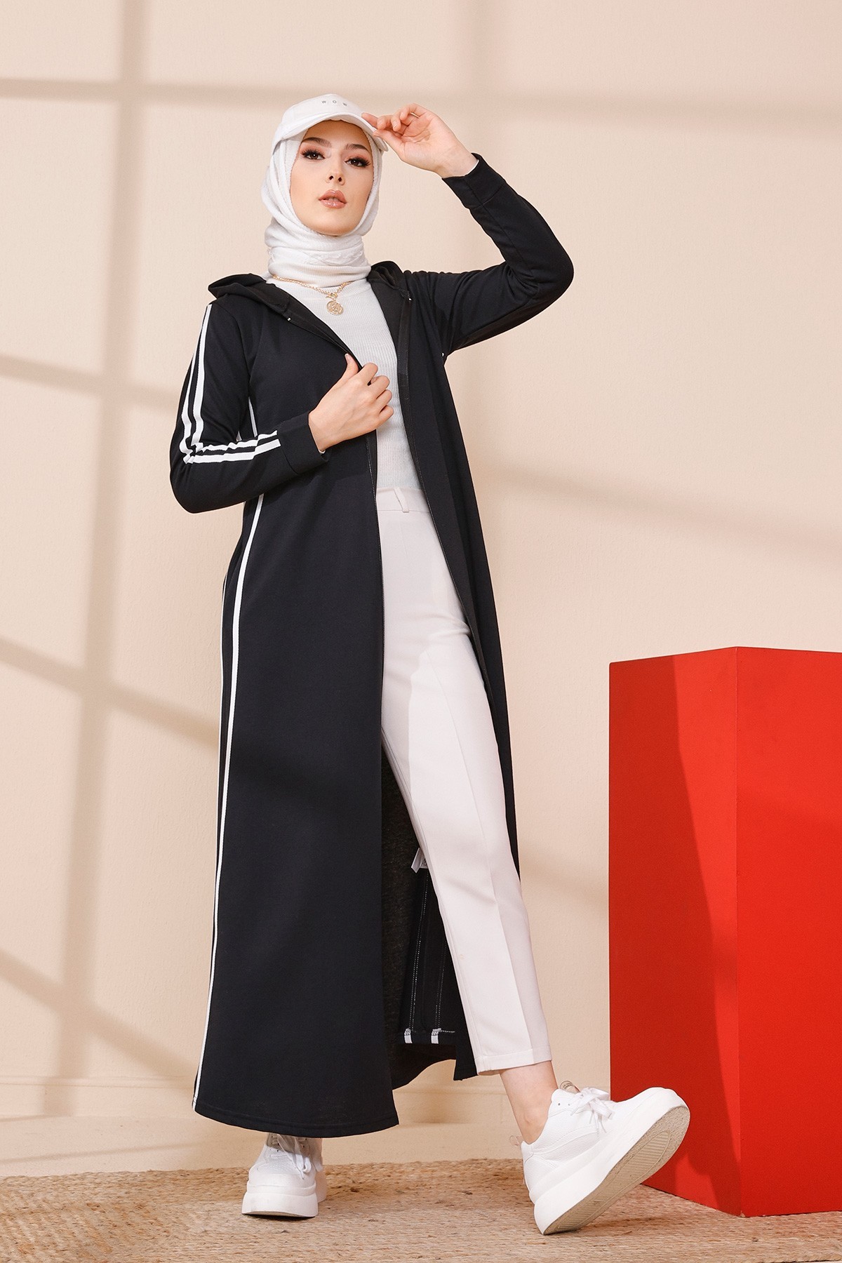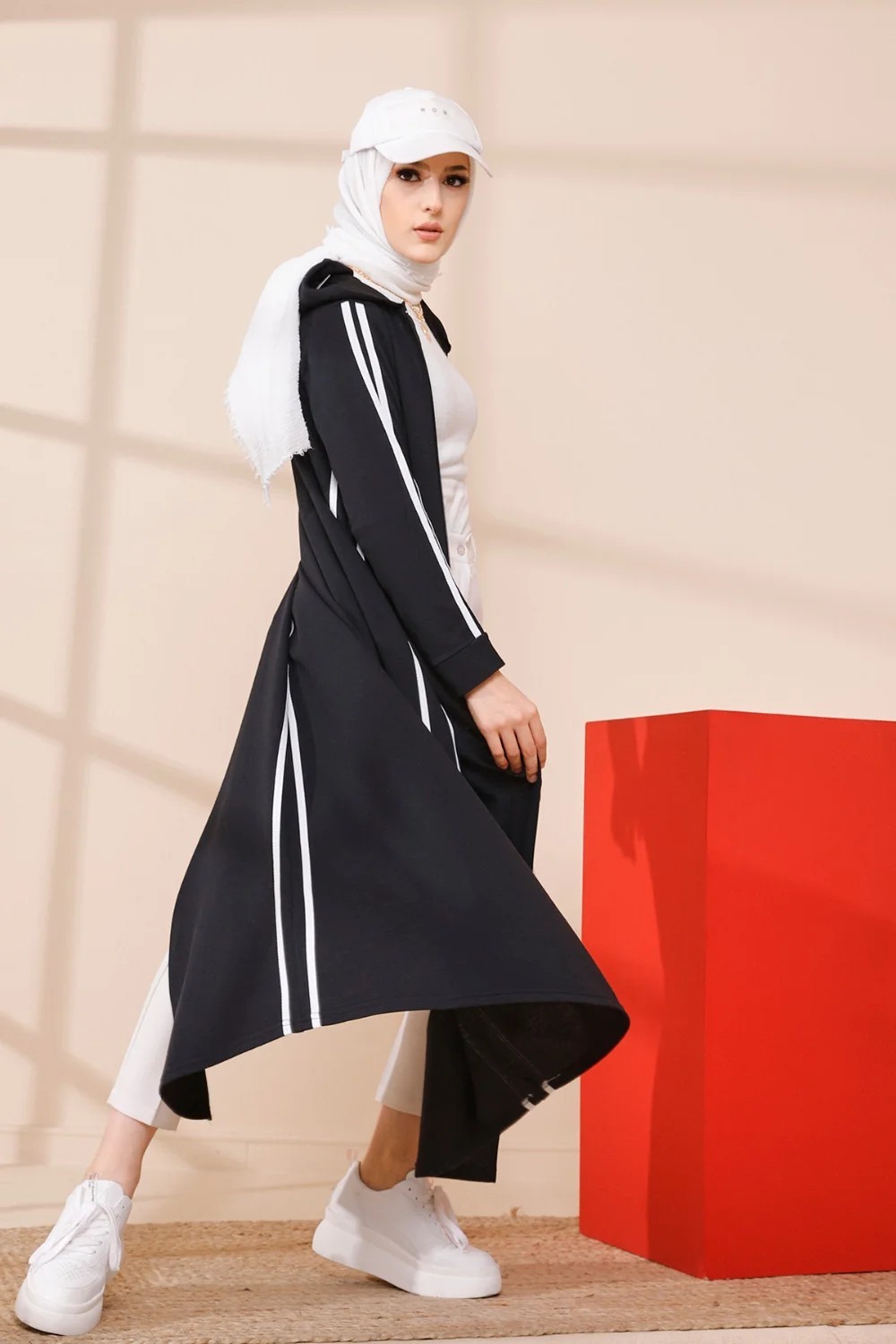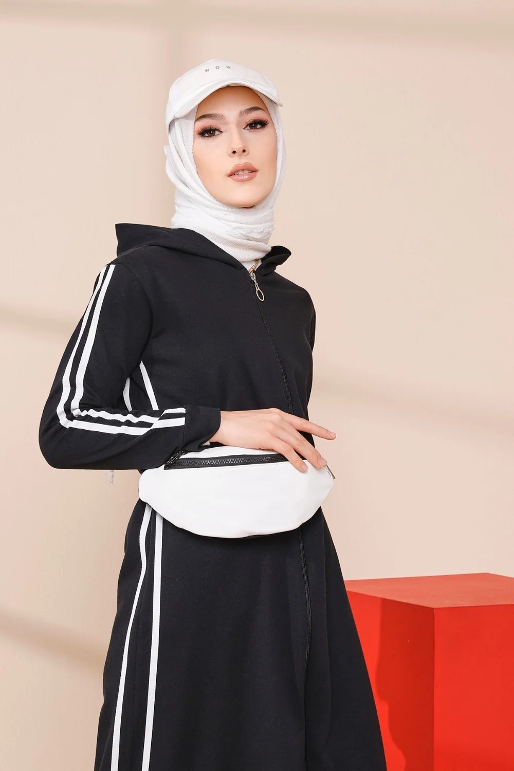 Gilet décontracté à capuche (Tunique sportwear pour femme voilée) - Couleur blanc et beige - REF. 33114 (27.00 €) - En Promotion à 19.90 €