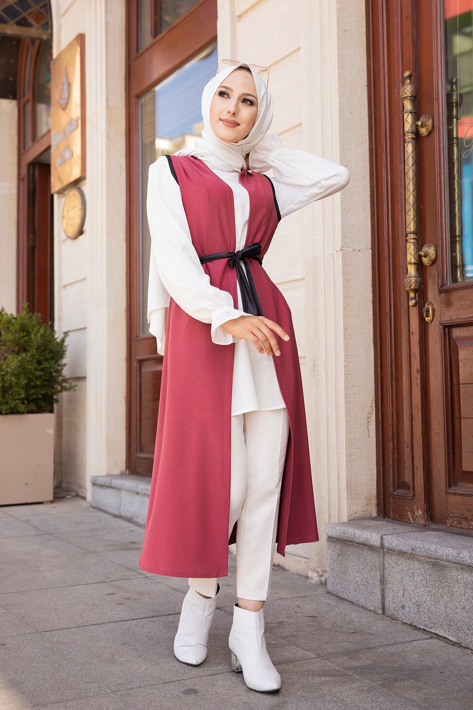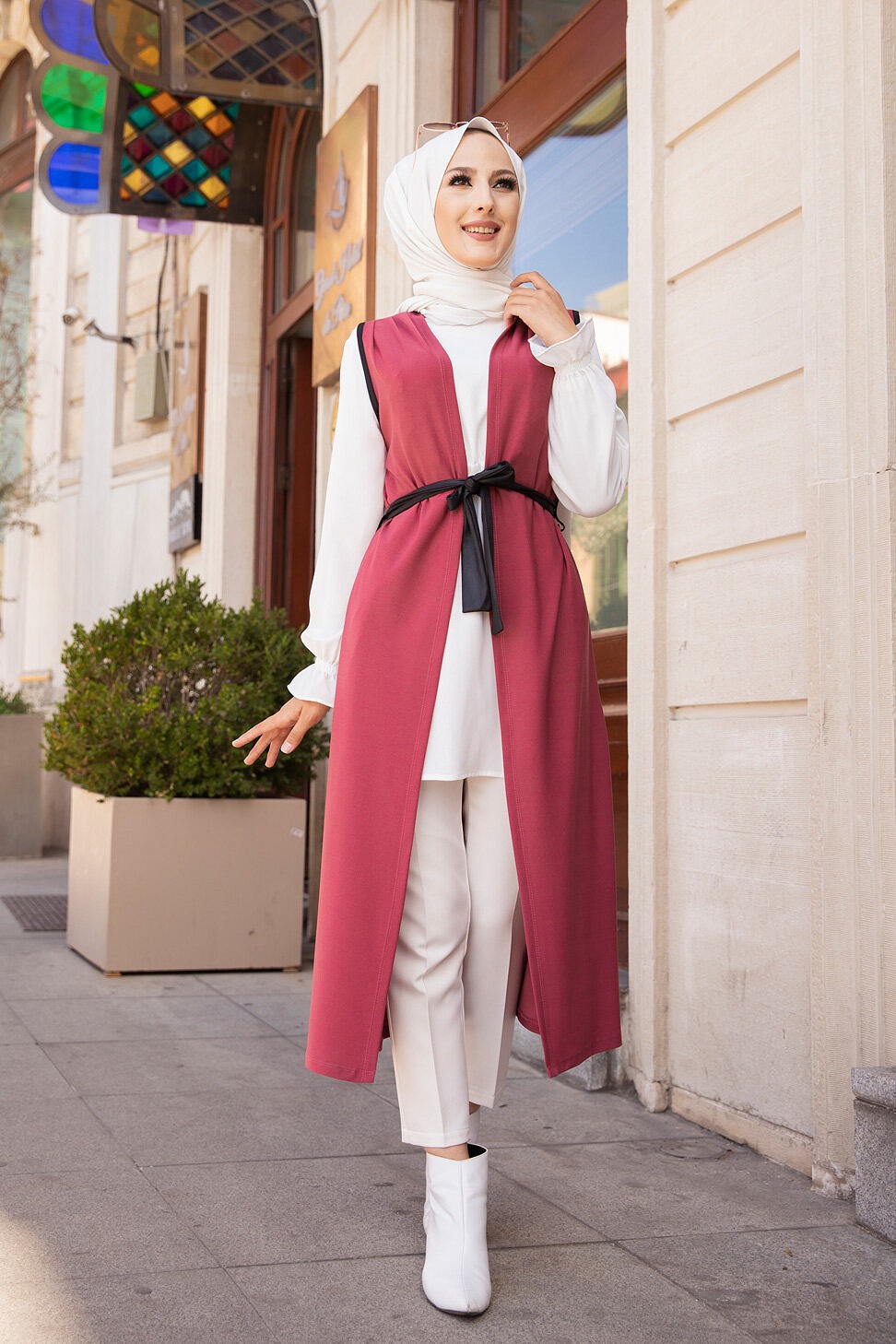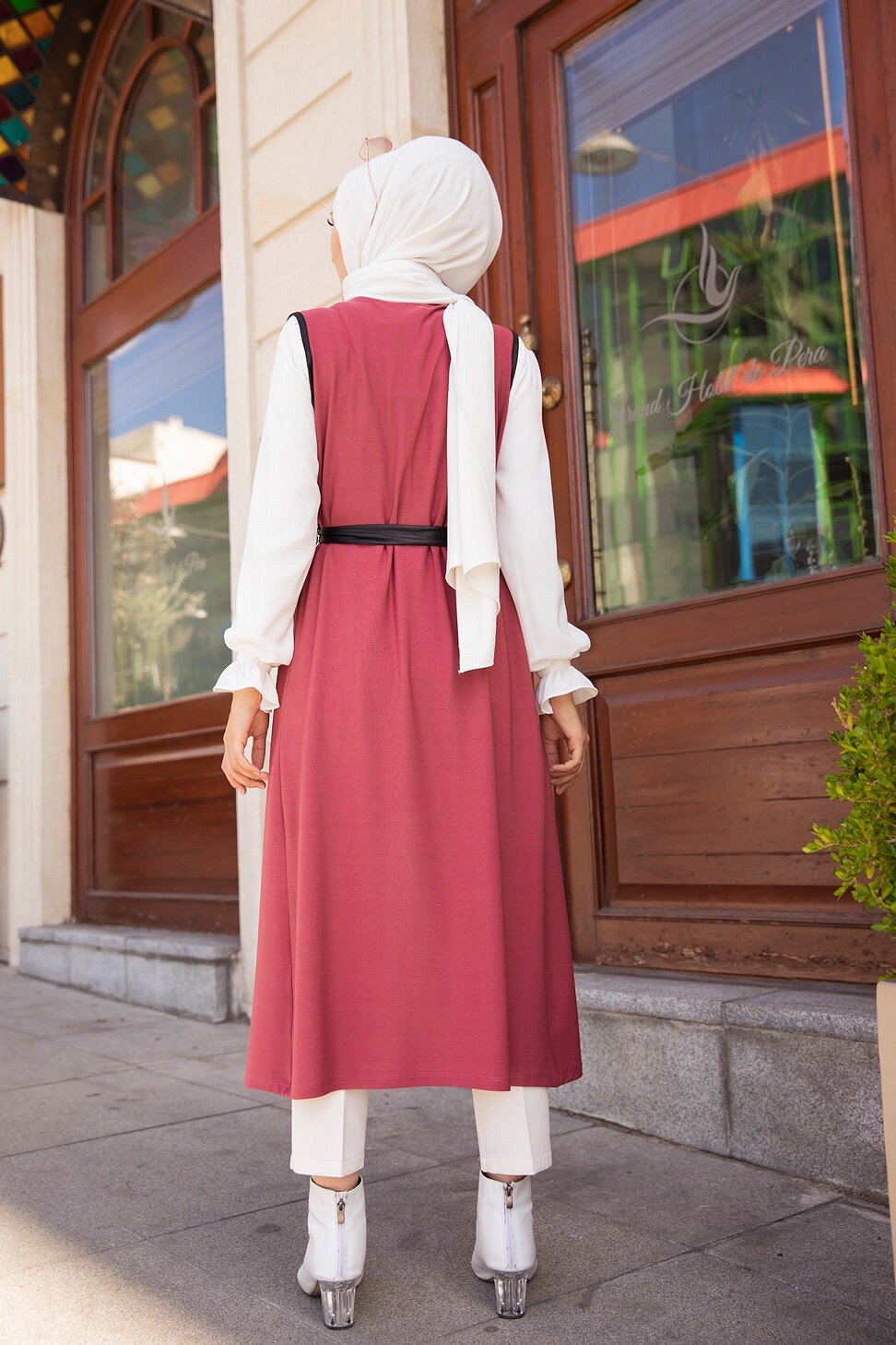 Gilet long sans manches avec ceinture noire (Tunique longue mastoura pour femme voilée) - Couleur Rose Vetement & Accessoire