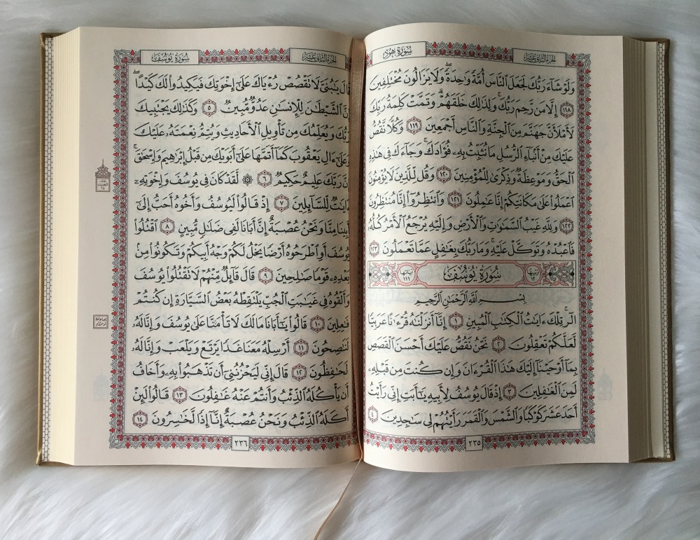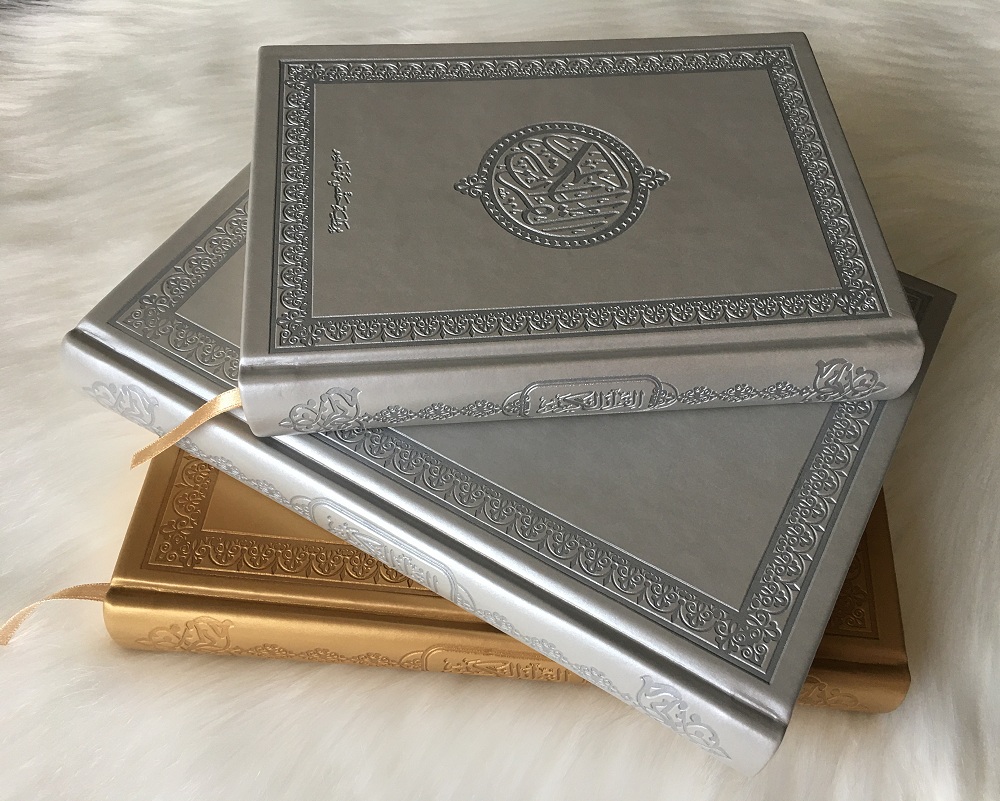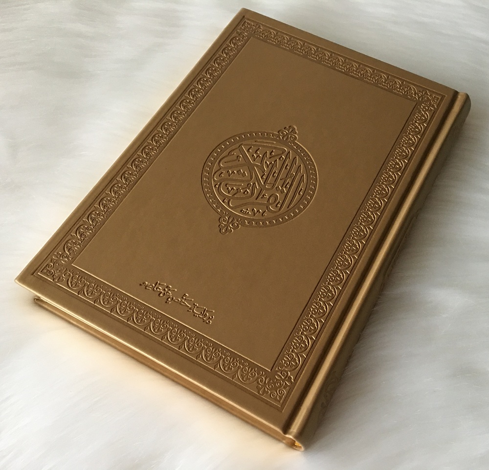 Coran de luxe grand format avec couverture de type cuir dorée de luxe (PU). Très doux au toucher, agréable à manier et ne ramasse pas la poussière.