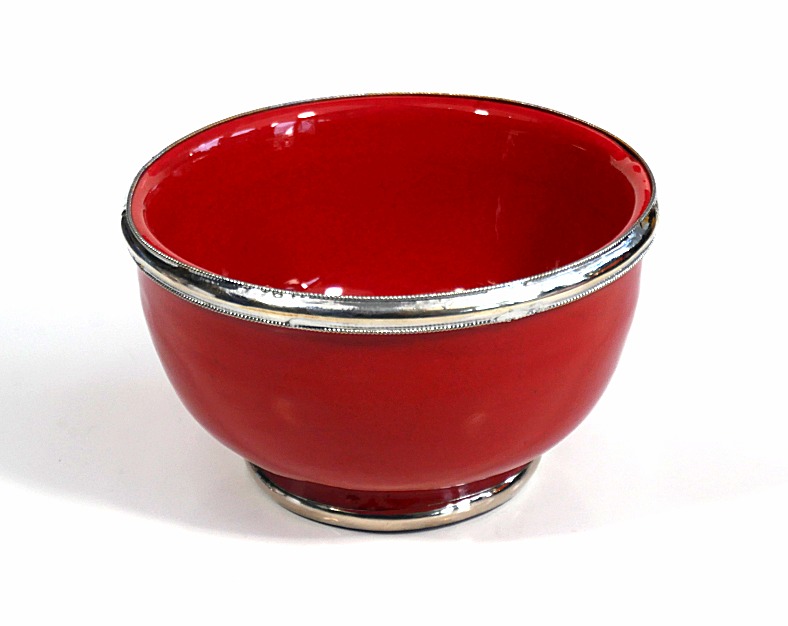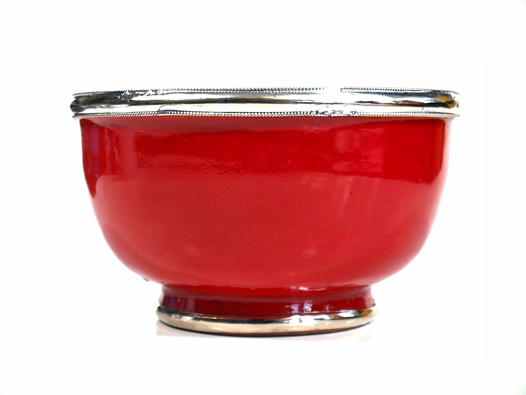 Grand bol en poterie marocain de couleur rouge brique emaille et cercle de metal argente