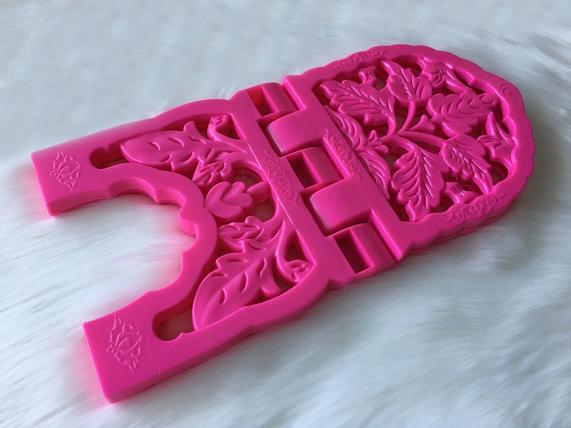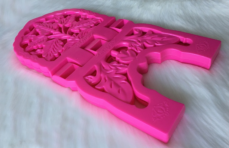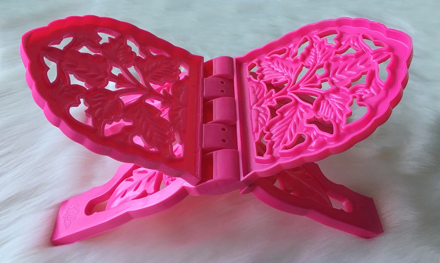 Porte livre léger et lavable en plastique rigide de couleur rose, avec motifs de fleurs et feuilles.
