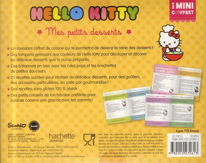 Un ravissant coffret de cuisine qui te permettra de devenir la reine des desserts ! Des tampons-pressoirs aux couleurs de Hello Kitty pour découper et décorer les délicieux desserts que tu auras préparés. Des bâtonnets en bois pour tes cake pops et tes brochettes de petites douceurs. 25 recettes sucrées pour réaliser de délicieux desserts, pour des goûters, des occasions particulières, ou juste par gourmandise ! Des recettes sans gluten 100 % plaisir.