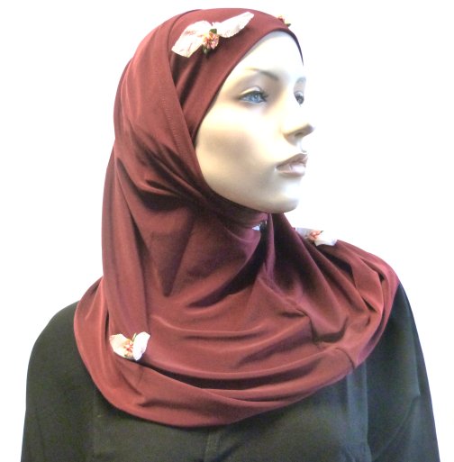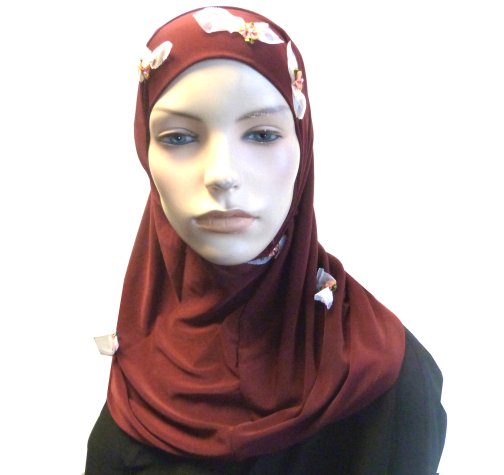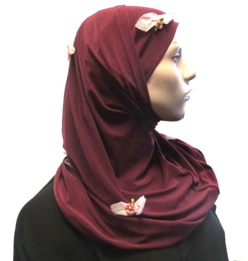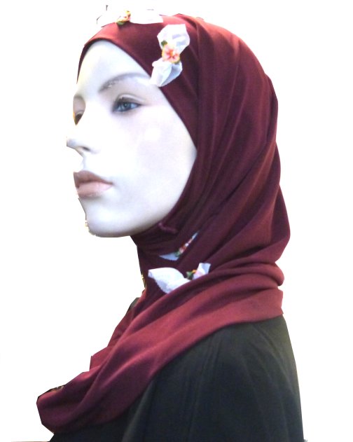 Hijab 2 pièces bordeaux agrémenté de petites fleurs et de tulle. Matière fluide, agréable au toucher et à porter. Composition : polycoton.