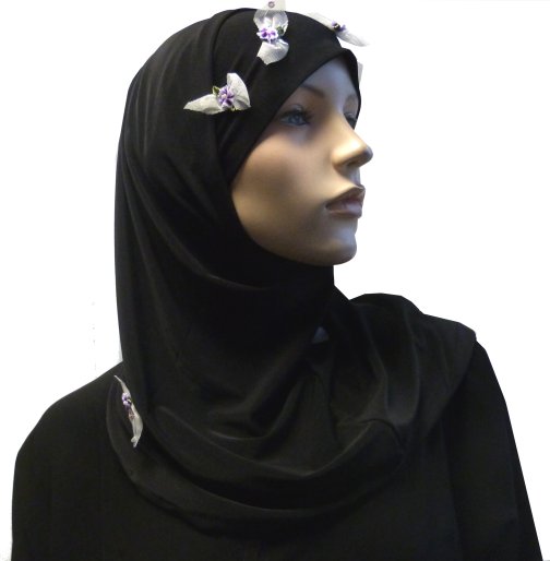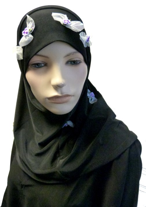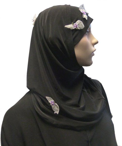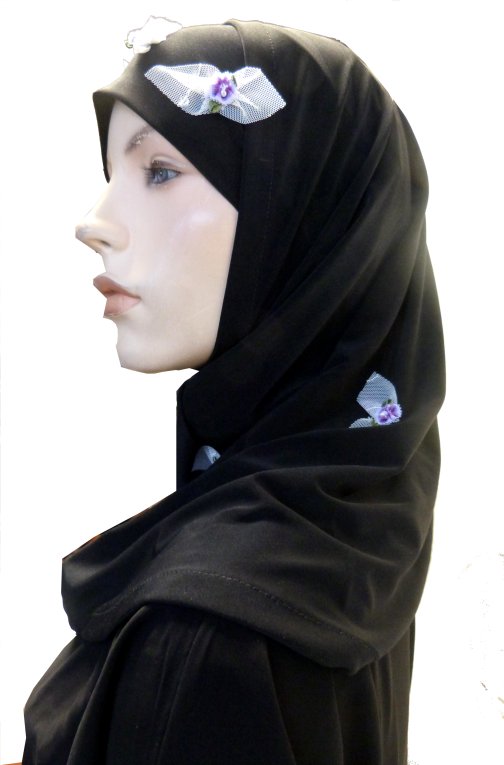 Hijab 2 pièces noir agrémenté de petites fleurs et de tulle.