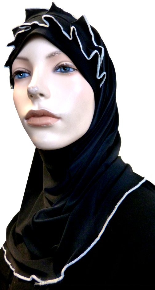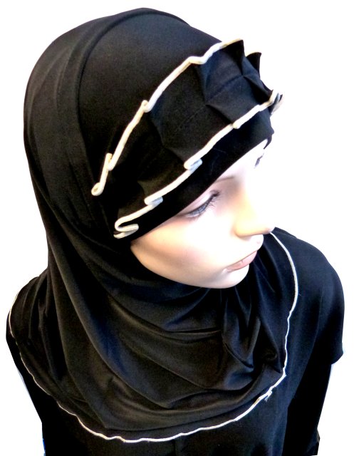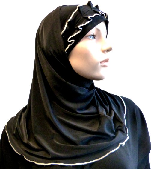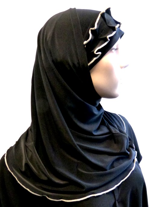 Très beau hijab 2 pièces noir avec ruban froncé piqué gris clair.