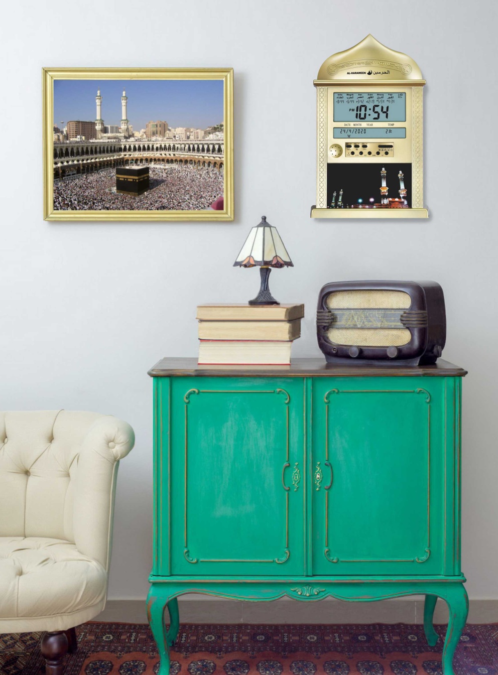 Horloge dorée avec calcul automatique des heures de prières et adhan (appel à la prière pour les 5 prières) - Al Harameen Clock HA-4010 - REF. 16946 (45.00 €) - En Promotion à 39.00 €
