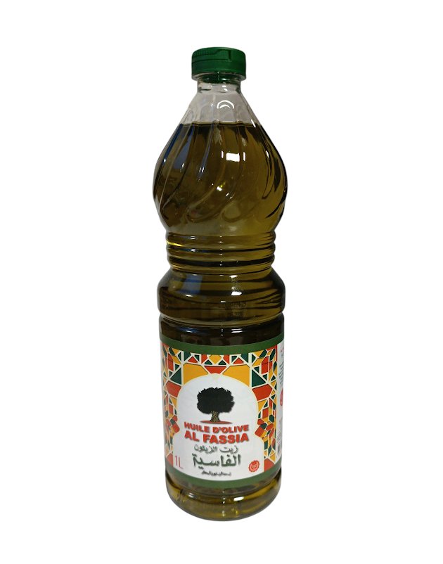 Bouteille de 1L d'huile d'olive vierge de la marque AL FASSIA 100% naturel. Huile d'olive obtenue directement des olives et uniquement par procédé mécanique.