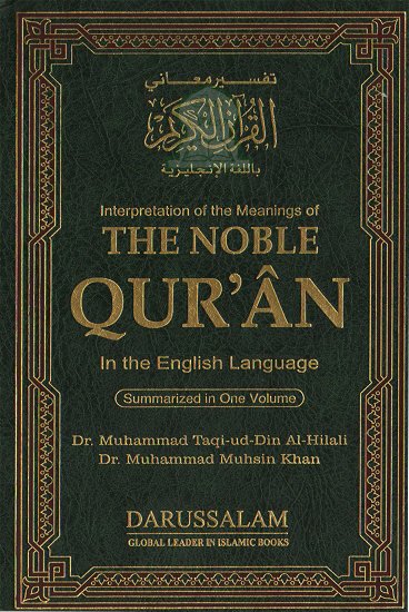 The Noble Qur'an is a widely popular translation by Islamic University - Madina scholars Dr. Muhsin Khan and Dr. Taqi-ud-Din Hilali. It features frequent footnotes gleaned by the translators from Tafsir At-Tabari, Tafsir Ibn Kathir, and Sahih-al-Bukhari. Arabic-English format with detailed index.