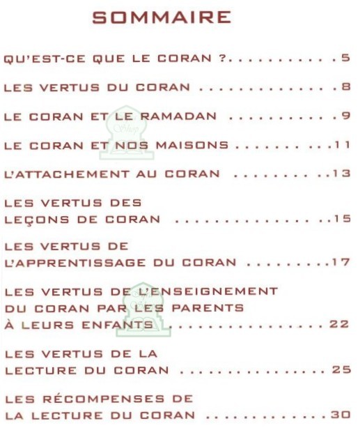 Cet ouvrage, après avoir fourni des informations préalables sur le Coran, traite des sujets tels que le Coran et nos maisons, le rapport entre le Ramadan et le Coran, et la vertu des leçons coraniques.