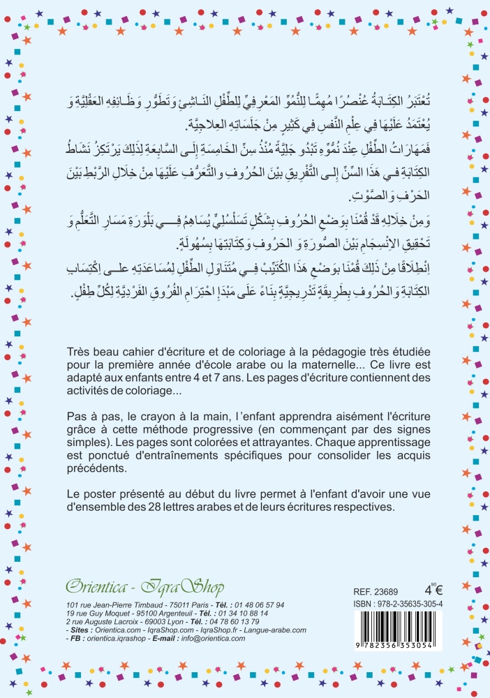 J’écris et je colorie mes lettres arabes avec les animaux (+ 56 stickers) - أَكْتُبُ وَأُلَوِّنُ حُرُوفِي الْعَرَبِيَّةَ مَعَ الْحَيَوَانَاتِ - REF. 39936 (4.90 €)