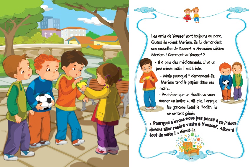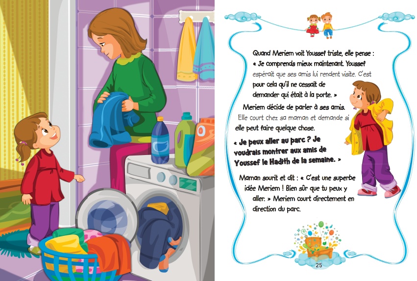 « J’apprends mon hadith » explique aux enfants comment obéir aux enseignements du prophète Mohamed (saw) dans la vie quotidienne. Les personnages principaux, un frère et une sœur, nommés Meriem et Youssef, ont une boîte à Hadith chez eux. Chaque livre de cette série concerne un Hadith particulier. Les membres de la famille essaient d’appliquer ce Hadith dans leur vie tout au long de l’histoire. Les enfants s’identifieront aux héros de l’histoire, ce qui facilitera leur apprentissage et leur pratique de tous les Hadiths.