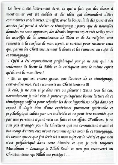 Ce livre représente l'épreuve vécue par un jeune musulman, détourné de sa religion par des prétendus prêcheurs qui exploitent la situation dramatique de l'Algérie, avec ce que cela entraîne comme vide spirituel et culturel, dans lequel se trouvent les jeunes algériens, pour leur inculquer une idée erronée selon laquelle « le salut » et « la tranquillité de l'âme » ne peuvent être trouvés que dans le Christianisme.