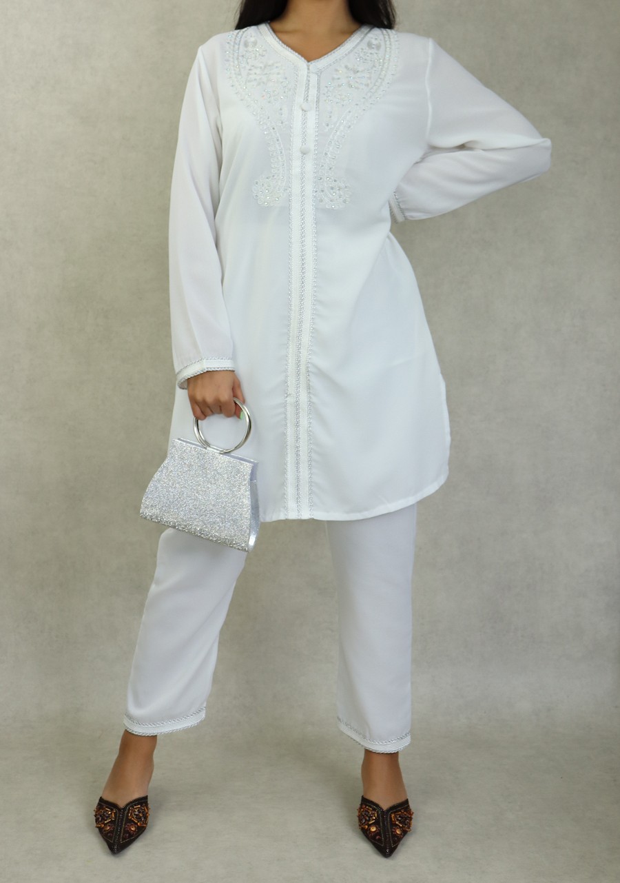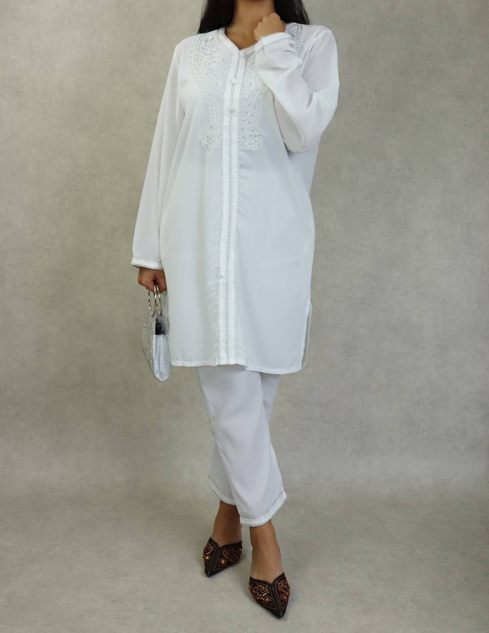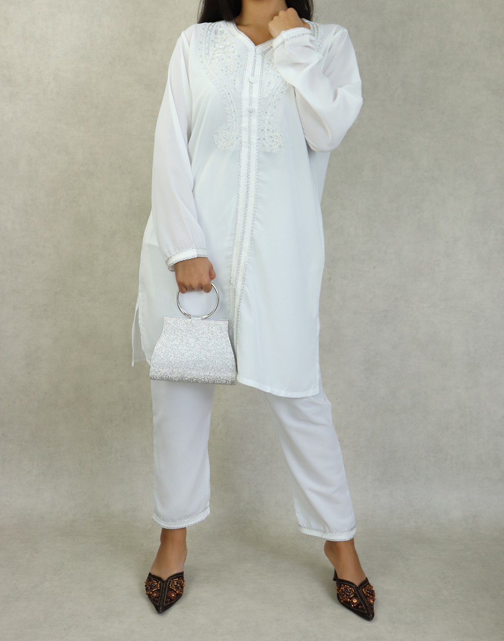 Jabador femme composé d’une tunique avec broderies sur le buste et sur les manches, et son pantalon assorti avec ceinture élastique, deux poches latérales, coupe droite.