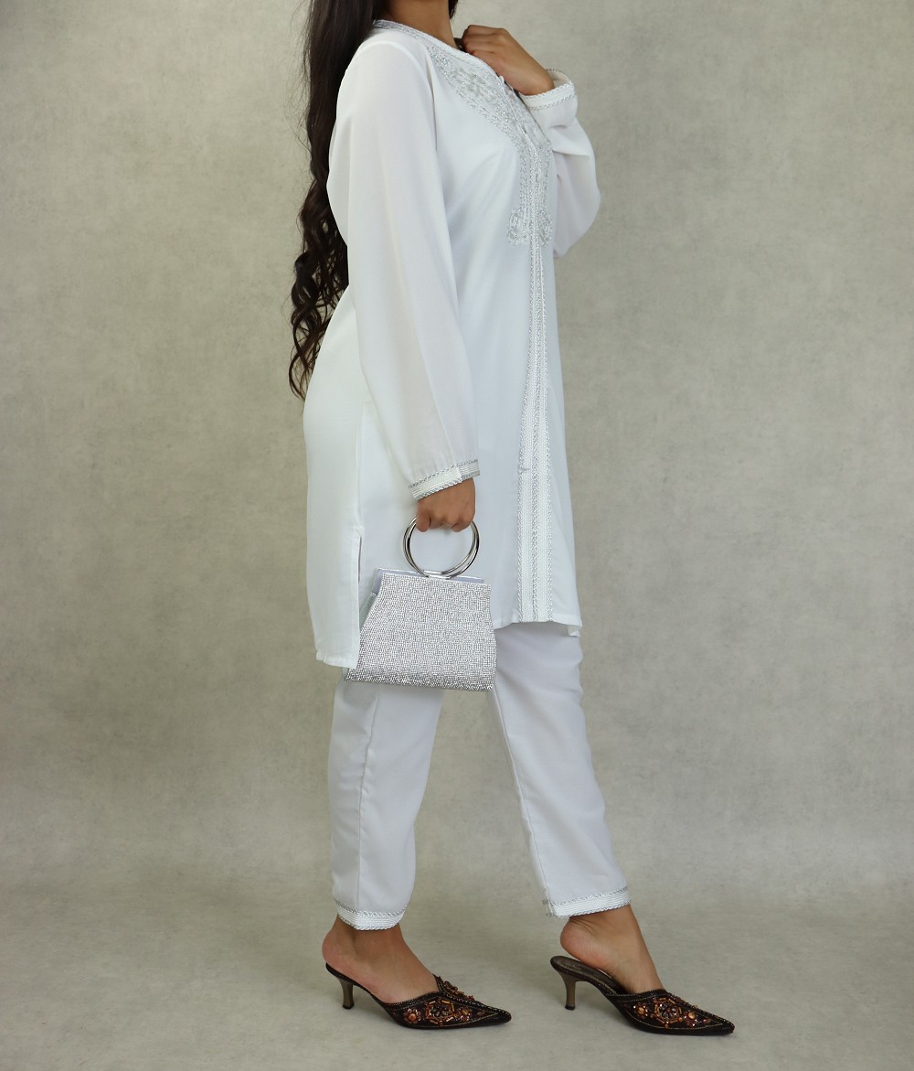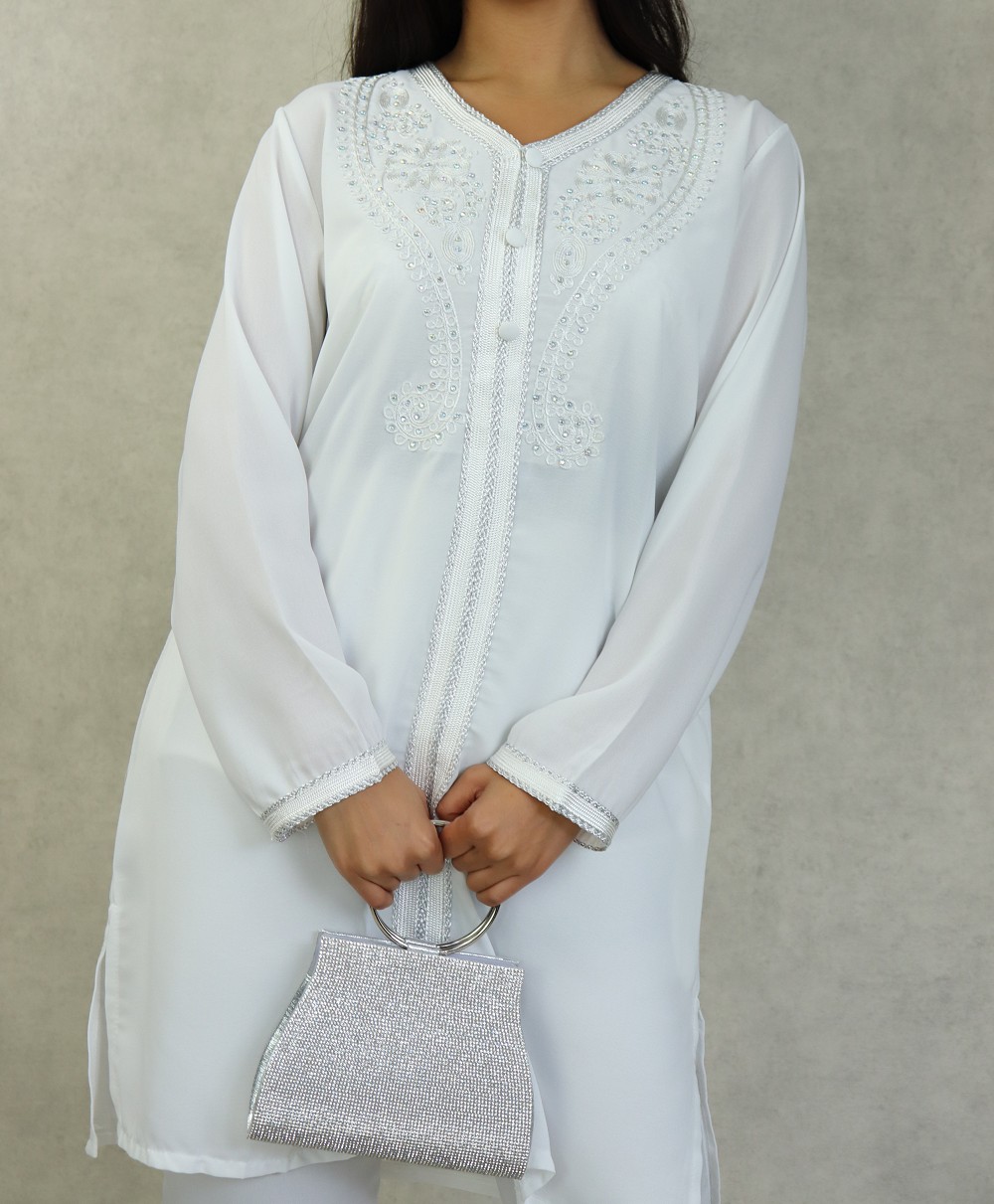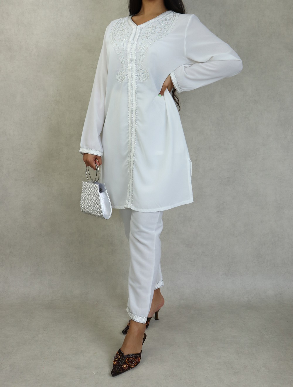 Jabador femme composé d’une tunique avec broderies sur le buste et sur les manches, et son pantalon assorti avec ceinture élastique, deux poches latérales, coupe droite.