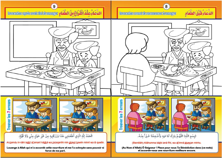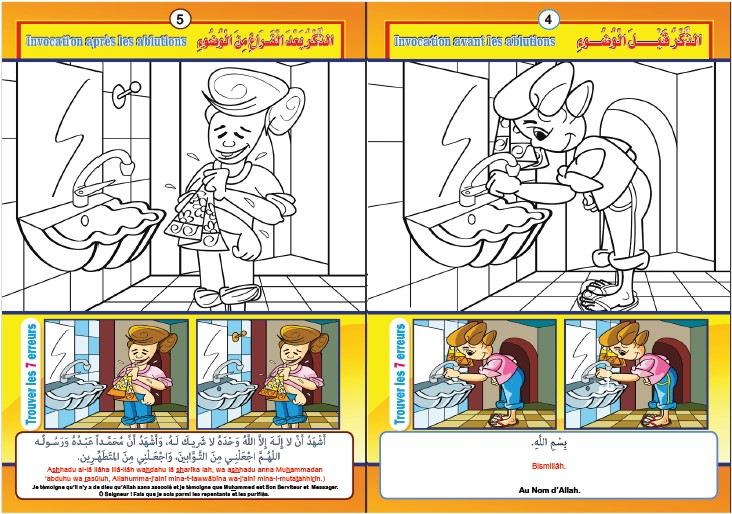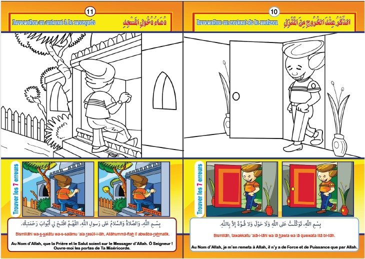 Voici un cahier d'activités qui présentent aux enfants des invocations en langue arabe, leurs traductions en français et leurs transcriptions phonétiques. Ce cahier d'activités contient des dessins à colorier qui correspondent chacun à une invocation essentielle: invocation au lever, invocation entrée des toilettes, invocation avant de commencer à manger, ...