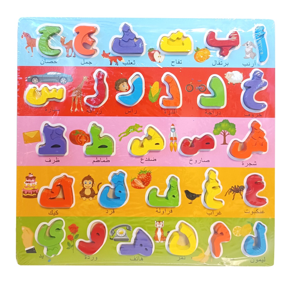 Jeu d'éveil de l'alphabet arabe en bois avec de grosses lettres de l'alphabet disposées dans l'ordre alphabétique... Chaque lettre peut entrer dans un seul emplacement donc pas de possibilité d'erreur.