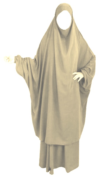 Ce Jilbab deux pièces est composé d’un demi-djilbab cache menton avec bandeau intégré manches élastiques, et d’une jupe.