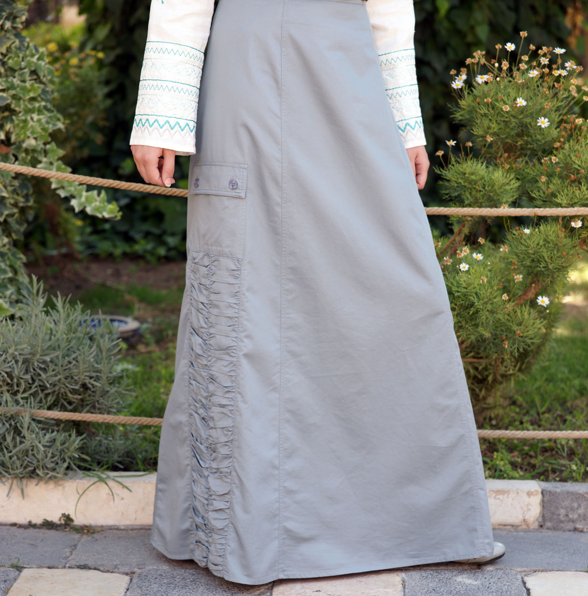 Jupe longueur totale; glissière sur le côté ; poches plaquées latérales avec rabats boutonnés...