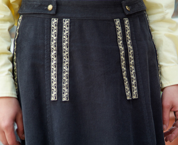 Description: full length; wide waistband with button flaps; 6 sets of embroidered bars - 4 in-between princess seams and 2 just inside side seams; slotted side zipper; Imported.