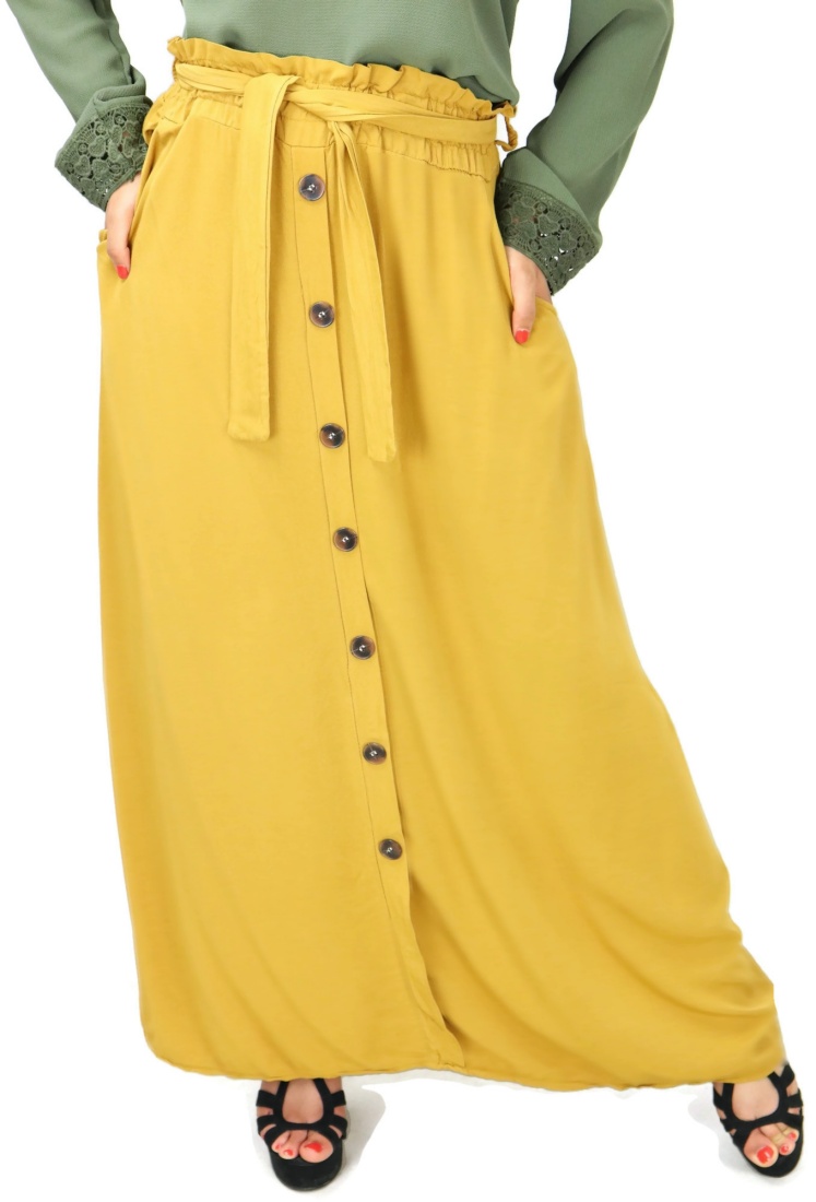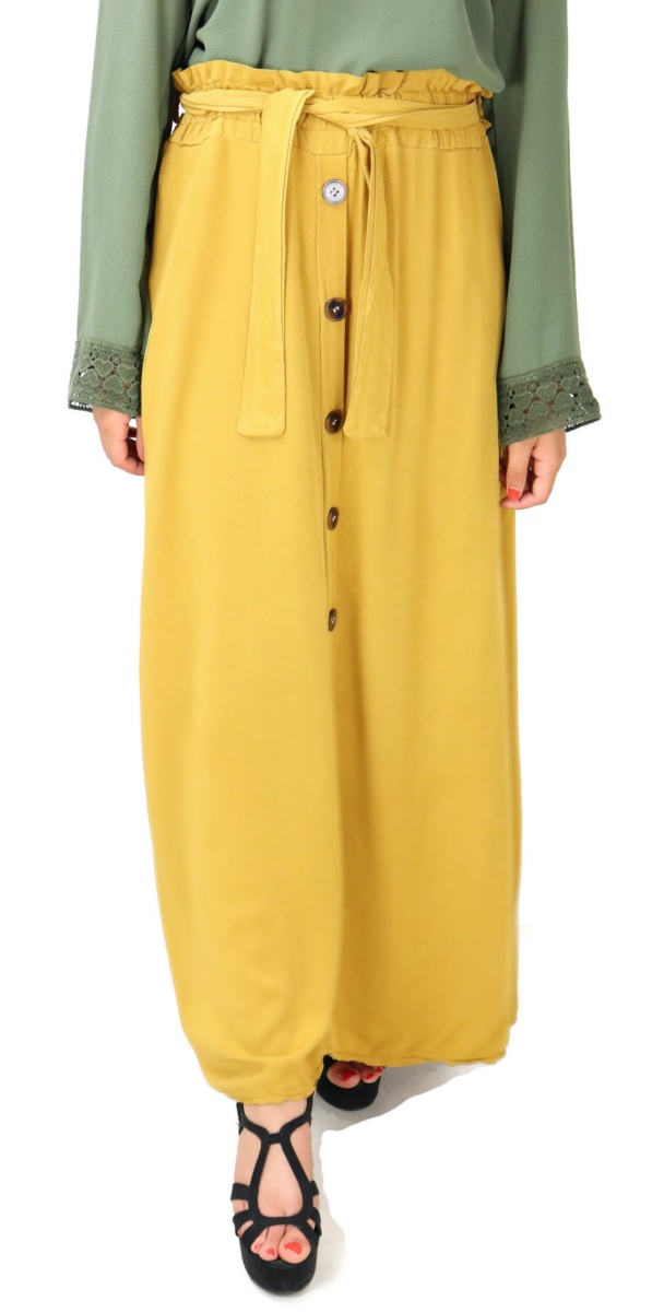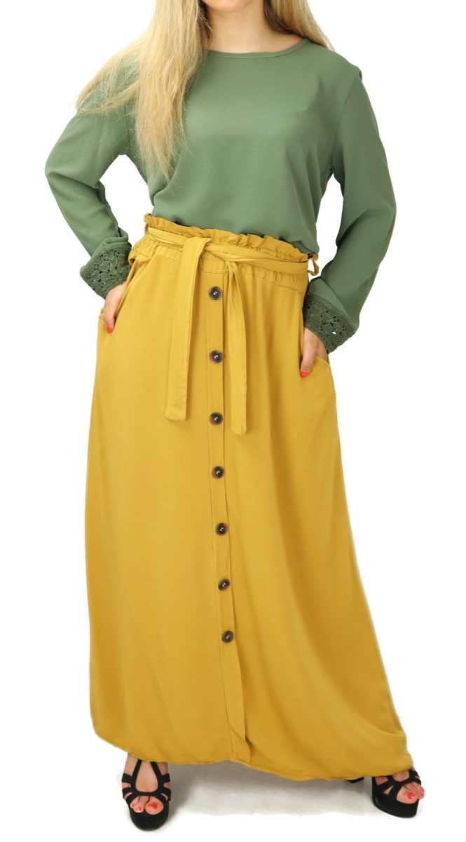 Cette pièce est unique en son genre. Remarquez tout le long de la jupe, les boutons déposés délicatement. Notez aussi sa couleur singulière qui vous rendra fière de posséder un modèle qui épouse vos courbes sans rien en montrer et qui vous couvre de la taille aux pieds !