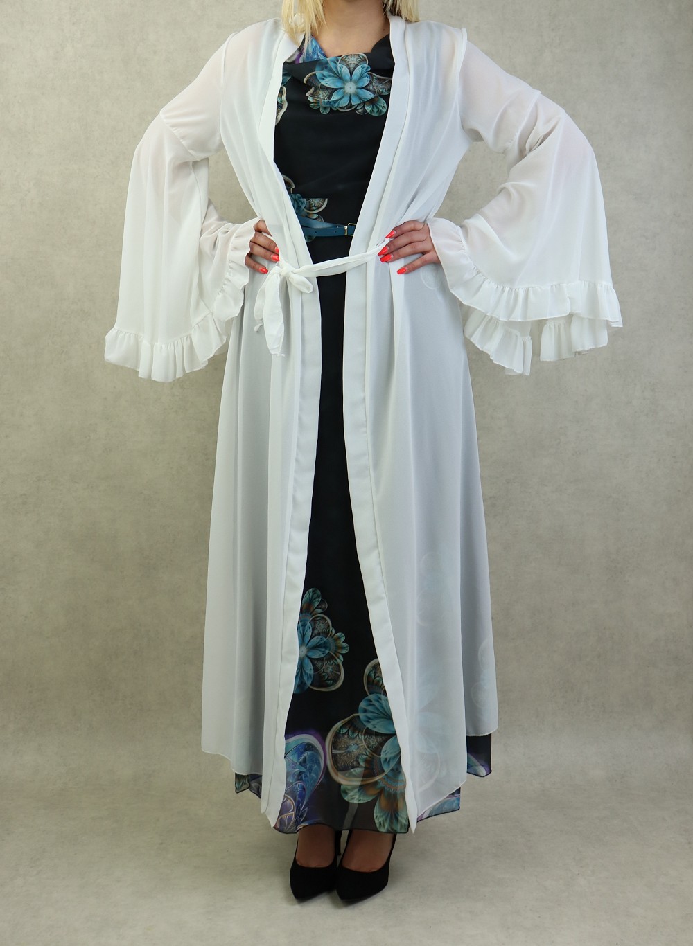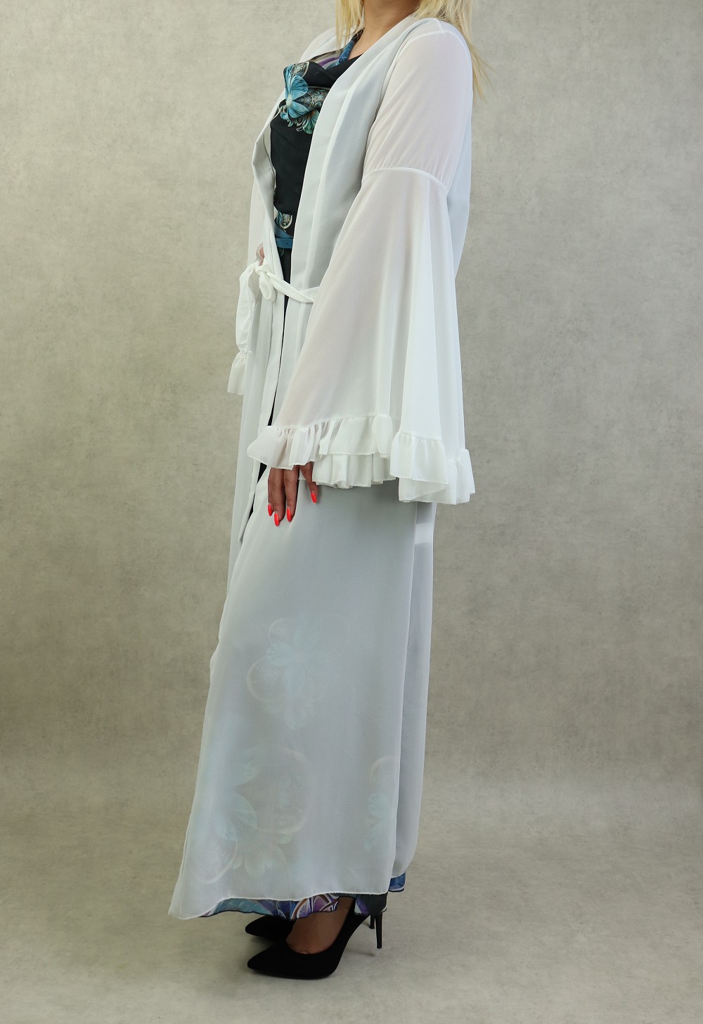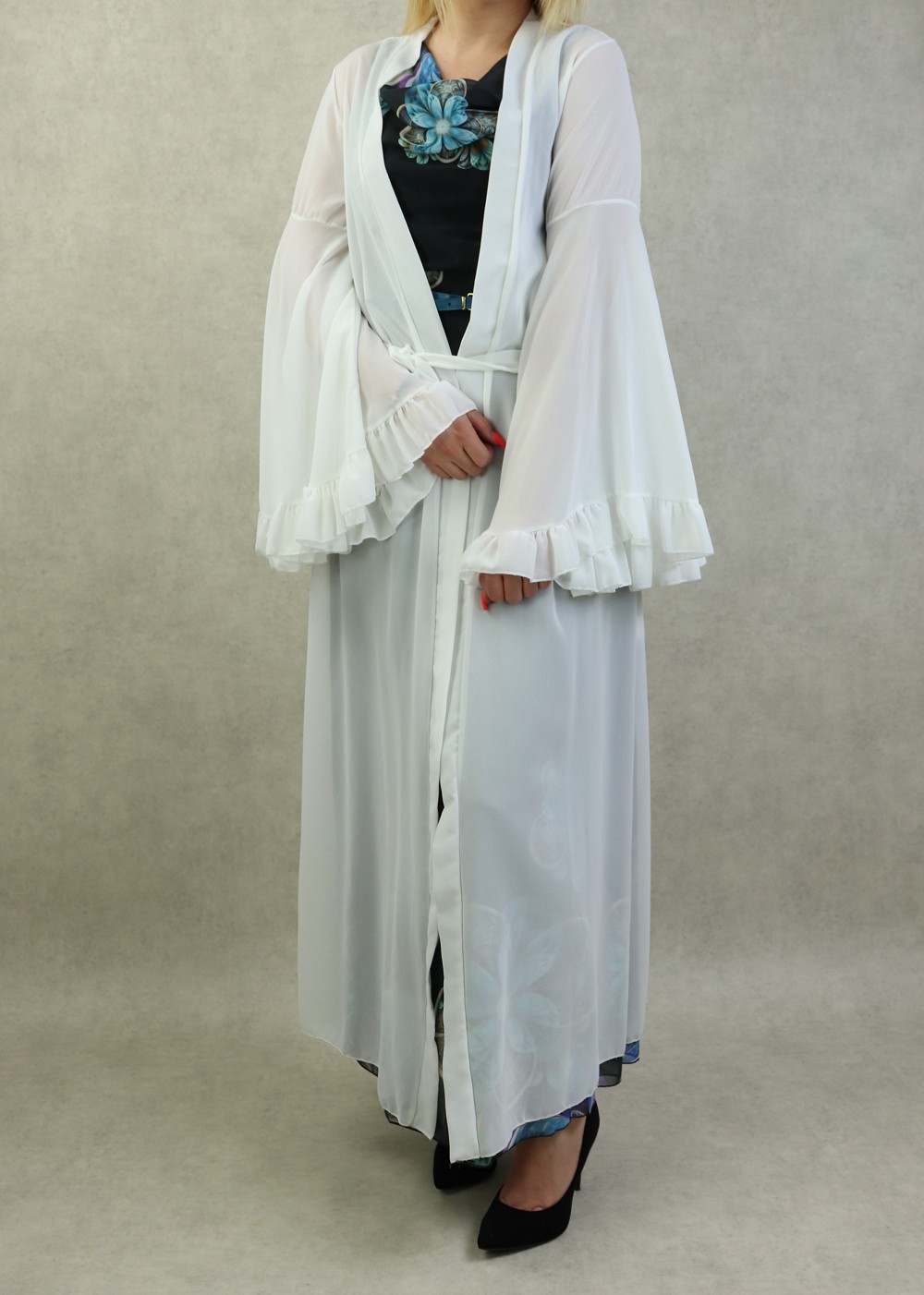 Kimono style bohème long, avec manches cloches et évasées, le tout accompagné d'une ceinture. Très joli à porter sur une robe.
