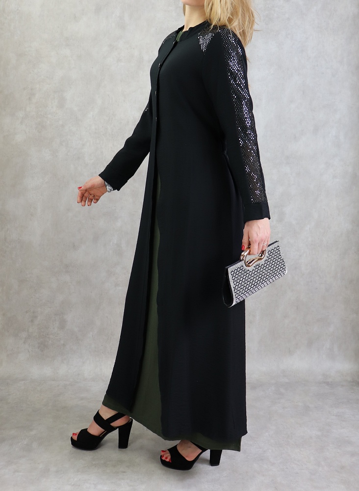 Gilet Veste longue col châle manches à froufrou (Vetement mastour en ligne pour femme voilée) - Couleur Kaki - REF. 33932 (25.00 €)