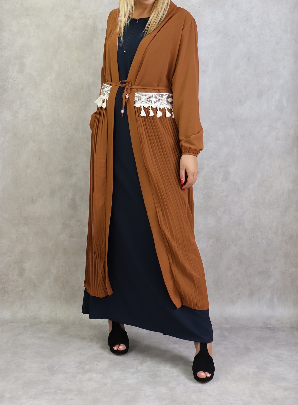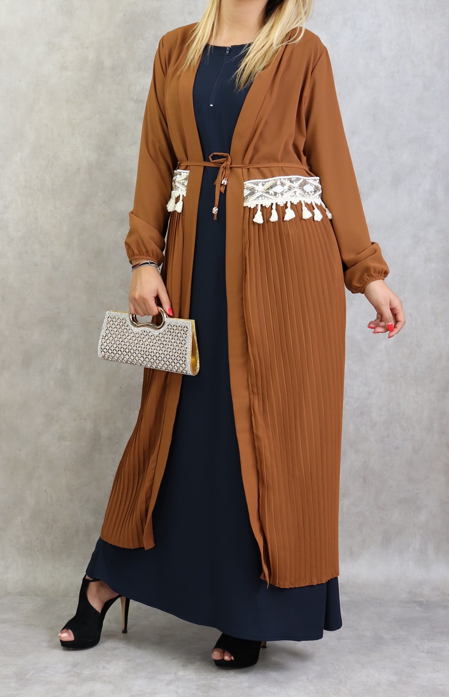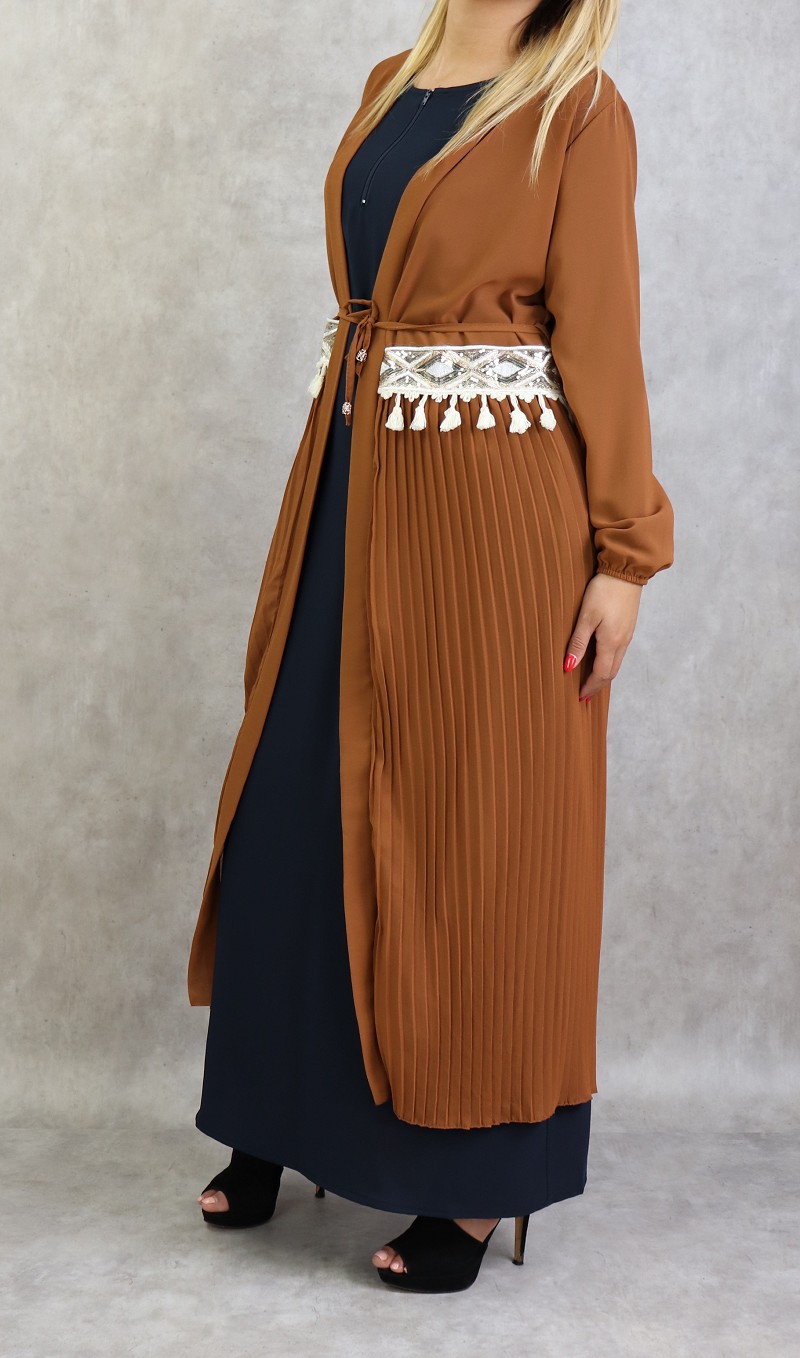 Kimono long plissé style oriental avec décorations et strass pour femme - Couleur caramel Vetement & Accessoire