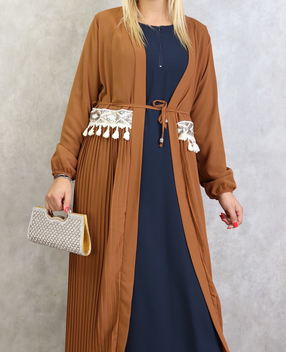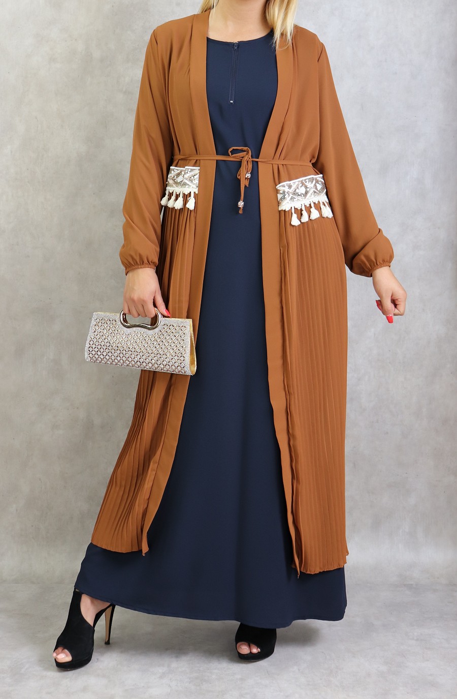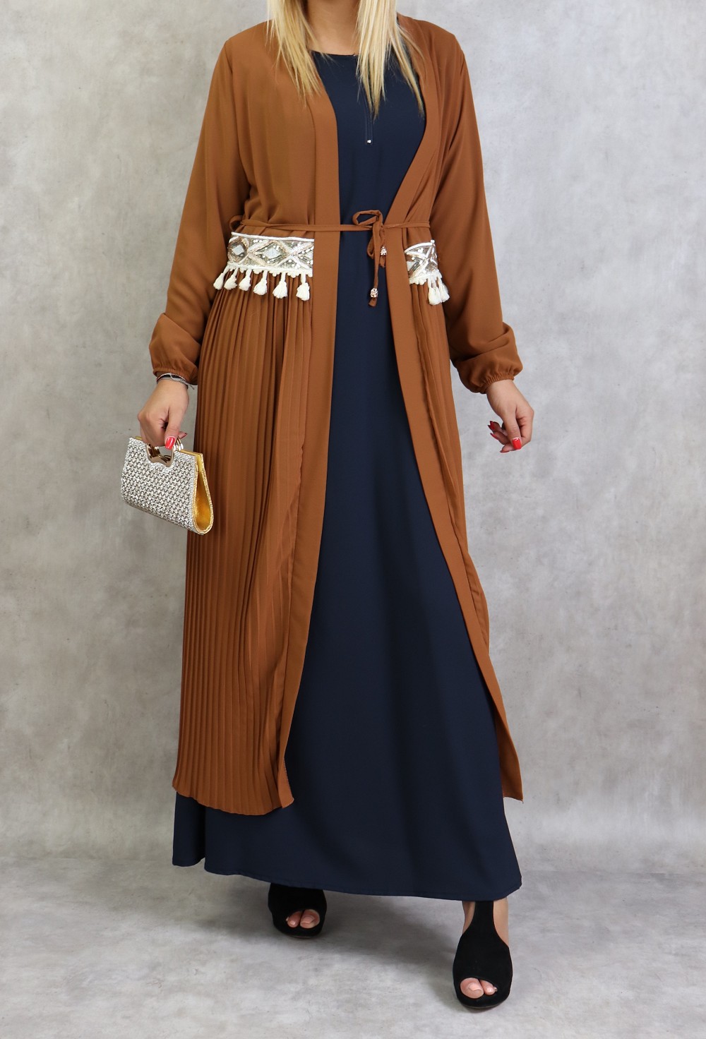 Kimono long plissé style oriental avec décorations et strass pour femme - Couleur caramel Vetement & Accessoire