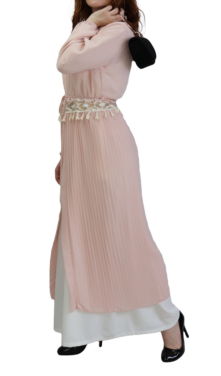Kimono long plisse style oriental avec decorations et strass pour femme - Couleur rose clair