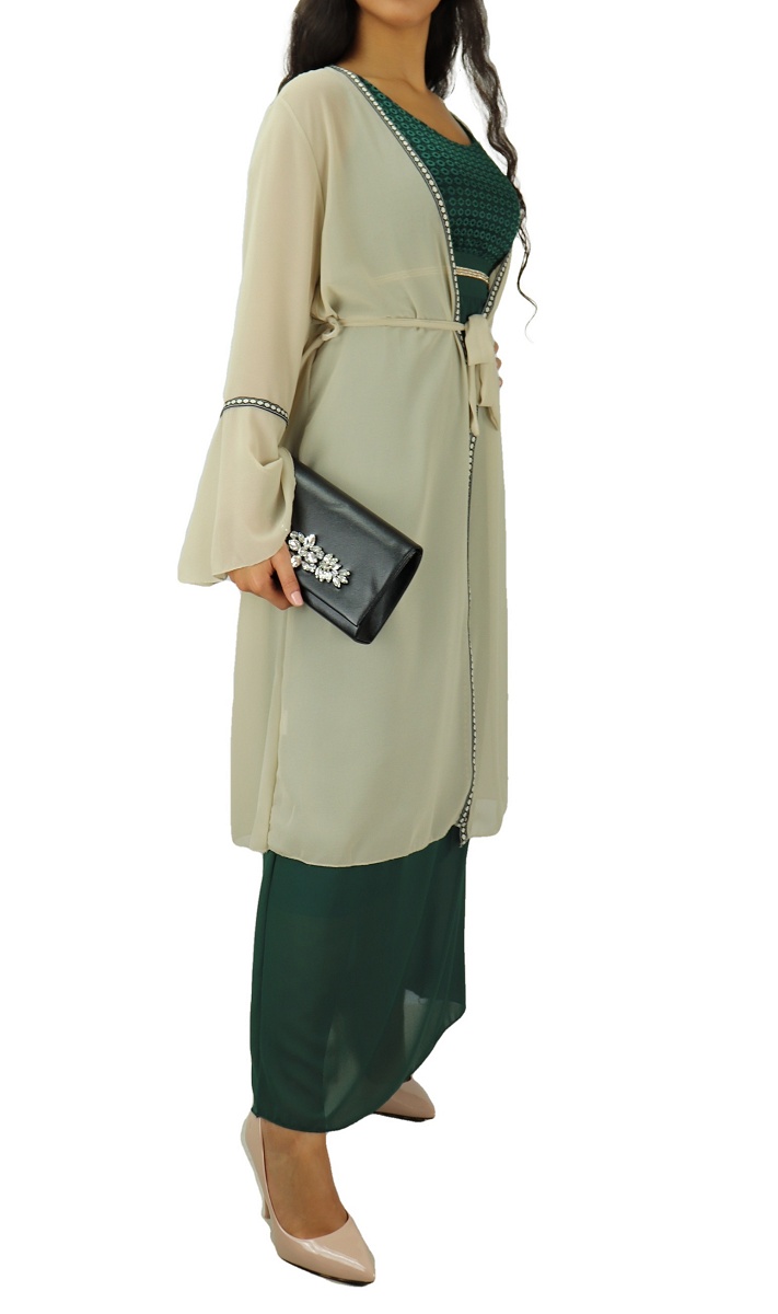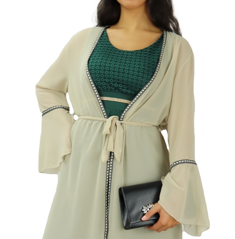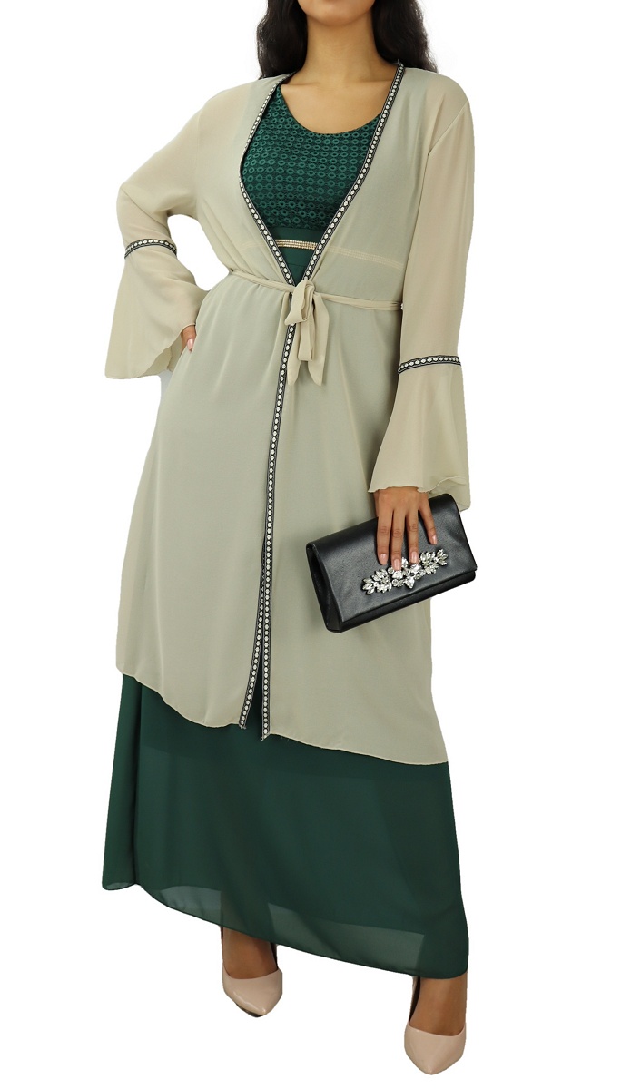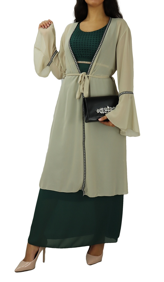 Robe de soirée style Abaya Dubaï noire ouverte de qualité avec broderie et strass et ceinture interne - REF. 38191 (49.00 €)