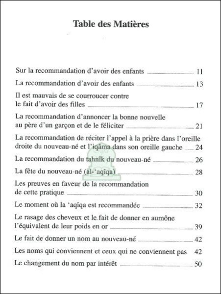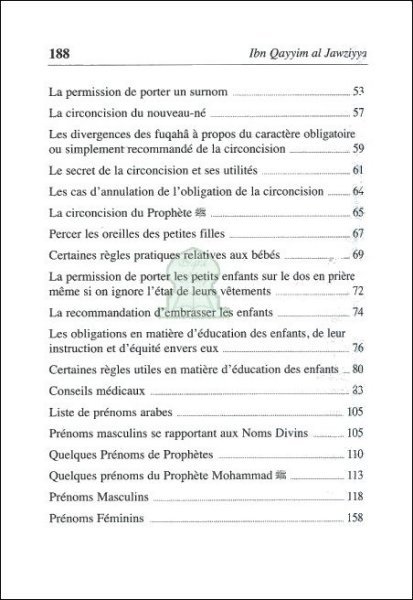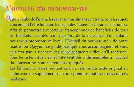 Afin de permettre aux lecteurs francophones de bénéficier de tous les bienfaits accordés par Dieu lors de la naissance d’un enfant, nous vous proposons ce livre « l’Accueil du nouveau-né » de notre maître Ibn Qayyim. Ce guide pratique vous accompagnera et vous éclairera par la richesse des renseignements utiles qu’il renferme. Tous les actes rituels et les interventions indispensables à « l’Accueil du nouveau-né » sont clairement expliqués.