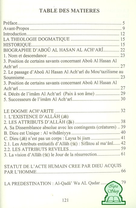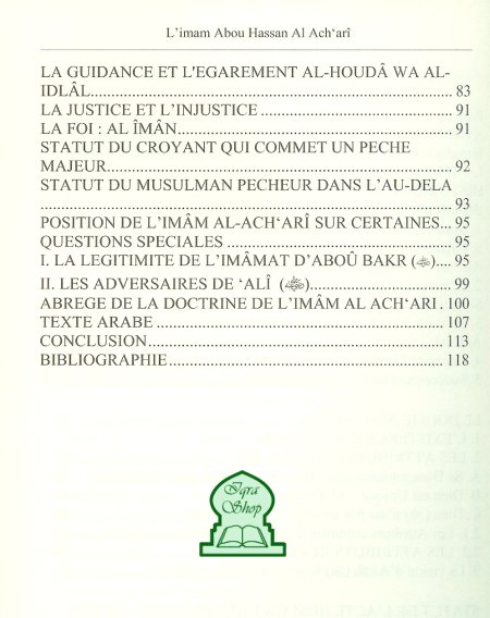 Cet ouvrage est le premier dans son genre, il a pour but de remplir un vide et d'apporter une connaissance de base sur la théologie ach'arite, méconnue par la masse musulmane, surtout les jeunes. Ainsi, la doctrine de l'imam Al Ach'ari est celle du juste milieu. En effet, l'usage de la raison dans la théologie dogmatique ach'arite est une évidence. Simplement, au contraire des Mou'tazilites, l'imam Al Ach'ari maintenait la primauté des Textes sur la raison. Al Ach'ari se dresse ainsi contre tout innovateur,conformément à ce que rapporte Ibn 'Asakir, qui souligne que l'Ach'arisme est partisan de la Sounna, défenseur de la Chari'a ; se dressant contre les innovateurs que sont les Qadarites, les Rafidites, et autres... Entre la conception anthropomorphique des Attributs d'Allah et leur négation par leur réduction à l'essence divine, Al Ach'ari affirme, au contraire, l'Unicité et l'Etrenité des Attributs divins.