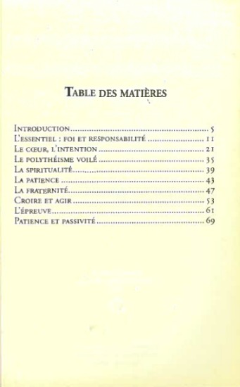 Il traite des chapitres suivants : la foi, la responsabilité, l’intention, la spiritualité, la fraternité, la croyance, l’épreuve et la patience.