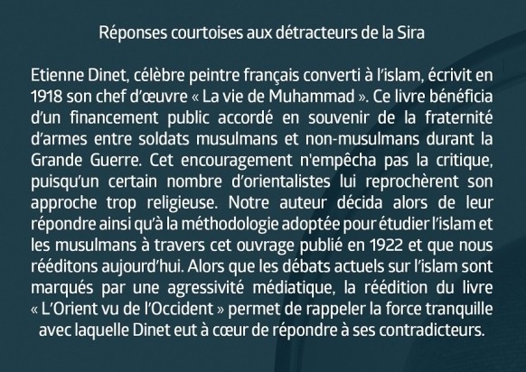 Étienne Dinet, célèbre peintre français converti à l'islam, écrivit en 1918 son chef d'œuvre « La vie de Muhammad ». Ce livre bénéficia d'un financement public accordé en souvenir de la fraternité d'armes entre soldats musulmans et non-musulmans durant la Grande Guerre. Cet encouragement n'empêcha pas la critique, puisqu'un certain nombre d'orientalistes lui reprochèrent son approche trop religieuse.