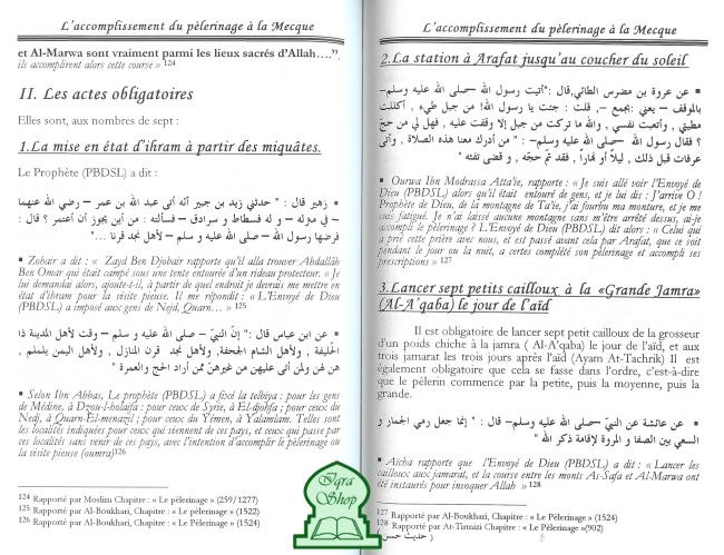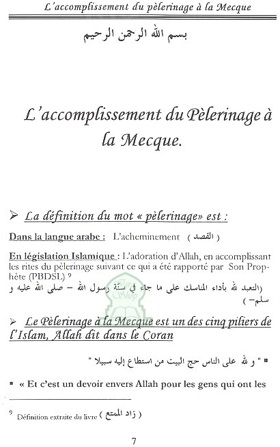 L'accomplissement du pélérinage a la Mecque: La vie d'un musulman est emplie d'actes d'adoration, tous se doivent , s'il l'on veut qu'ils soient acceptés par Allah, d'être accomplis en respectant deux points essentiels: que l'acte d'adoration soit accompli exclusivement pour Allah et que l'acte est pour origine le Coran ou la Sunna du Prophète(SWS).