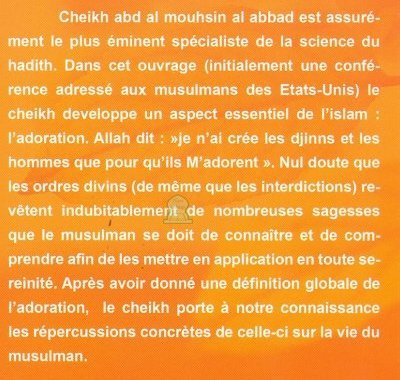 Cheikh Abd Al Mouhsin Al 'Abbad est assurément le plus éminent spécialiste de la science du hadith. Dans cet ouvrage (initialement une conférence adressé aux musulmans des États Unis) le cheikh développe un aspect essentiel de l'islam : l'adoration. Allah dit << je n'ai crée les djinns et les hommes que pour qu'ils M'adorent>>. Nul dote que les ordres divins (de même que les interdictions) revêtent indubitablement de nombreuses sagesses que le musulman se doit de connaître et de comprendre afin de les mettre en application en toute sereinité. Après avoir donné une définition globale de l'adoration, le cheikh porte à notre connaissance les répercussions concrètes de celle-ci sur la vie du musulman.