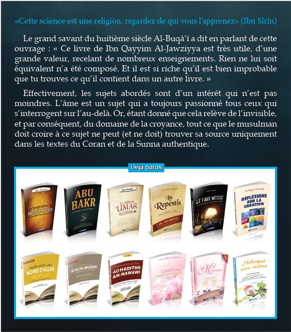 Le grand savant du huitième siècle Al-Buqâ'î a dit en parlant de cette ouvrage : " C'est un livre très utile, d'une grande valeur, recelant de nombreux enseignements. Rien ne lui soit équivalent n'a été composé.Et il est si riche qu'il est bien improbable que tu trouves ce qu'il contient dans un autre livre ". Effectivement, les sujets abordés sont d'un intérêt qui n'est pas moindre. L’âme est un sujet qui a toujours passionné tous ceux qui s'interrogent sur l'au-delà. Or, étant donné que cela relève de l'invisible, et par conséquent, du domaine de la croyance, tout ce que le musulman doit croire à ce sujet ne peut (et ne doit) trouver sa source uniquement dans les textes du Coran et de la Sunna authentique.